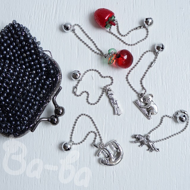 {当ショップでがま口をご購入の方のみ購入可能です} ばあばのがま口は素材を生かしたシンプルながま口、きっとご購入後にチャームなど色々付けて自分流にカスタマイズして、楽しんでいただいているとは思いますが・・・ ネットでカワイイチャームを見つけても、1コじゃ送料の方が高いし。。。 5コや10コのセット販売ばかりでそんなたくさん要らないし。。。。。 そこで、こんなのばあばのがま口に付けたらカワユイなぁというチャームをセレクト☆ がま口の価格にチャーム代をプラスして出品しますでのご希望の場合は、がま口購入前にメッセージよりお問い合わせください。 --------------------------------------------- ¶ アクリルフルーツチャーム ¥140 ・クリアいちご ・不透明いちご ・クリアりんご ・不透明りんご ・クリアさくらんぼ ・不透明さくらんぼ https://baaba.thebase.in/items/36331496 --------------------------------------------- ¶ ファーボールチャーム ¥120 ・ベージュ ・ブラウン ・ホワイトグレー https://baaba.thebase.in/items/36331636 --------------------------------------------- ¶ メタルチャーム ¥120 ・トラ(SL) ・ハチドリ(SL) ・キツネ(SL) ・コアラ(AT/SL) ・トカゲ(SL) ・オオカミ(SL) ・拳銃(GL/SL) ・飛行機(AT) ・いちご(GL/SL) ・りんご(GL/SL) ・パピー(SL) ・ラマ(SL) ・ネコ(GL) ・松ぼっくり(SL) ・レトリバー(SL) ・どんぐり(GL/SL) ・ナマケモノ(SL) ・ヒョウ(SL) ・クマ(SL) ・アルマジロ(SL) ・サメ(SL) ・スーパーサウルス(SL) ・コウノトリはさみ(SL) ・手錠(SL) https://baaba.thebase.in/items/36331698 --------------------------------------------- ボールチェーン:ボール径1.5mm、長さ約10cm 鈴:約7.5mm *「アクリルフルーツチャーム」と「ファーボールチャーム」は〝ボールチェーン+鈴〟のご希望のカラー〈アンティーク/AT、ゴールド/GL、シルバー/SL〉からお選びください。 *「メタルチャーム」はメタルのカラーに〝ボールチェーン+鈴〟のカラーに合わせますが、変更のご要望あればご連絡ください。 *チャームのサイズや材質等ご質問あればお問い合わせください。 *以前購入したがま口にも付けたい、複数ご希望の場合はご連絡ください。 *「手さげバッグ」にも付けれます♪ *使用例photo https://shop2155.amebaownd.com/pages/4378639/page_202011091127