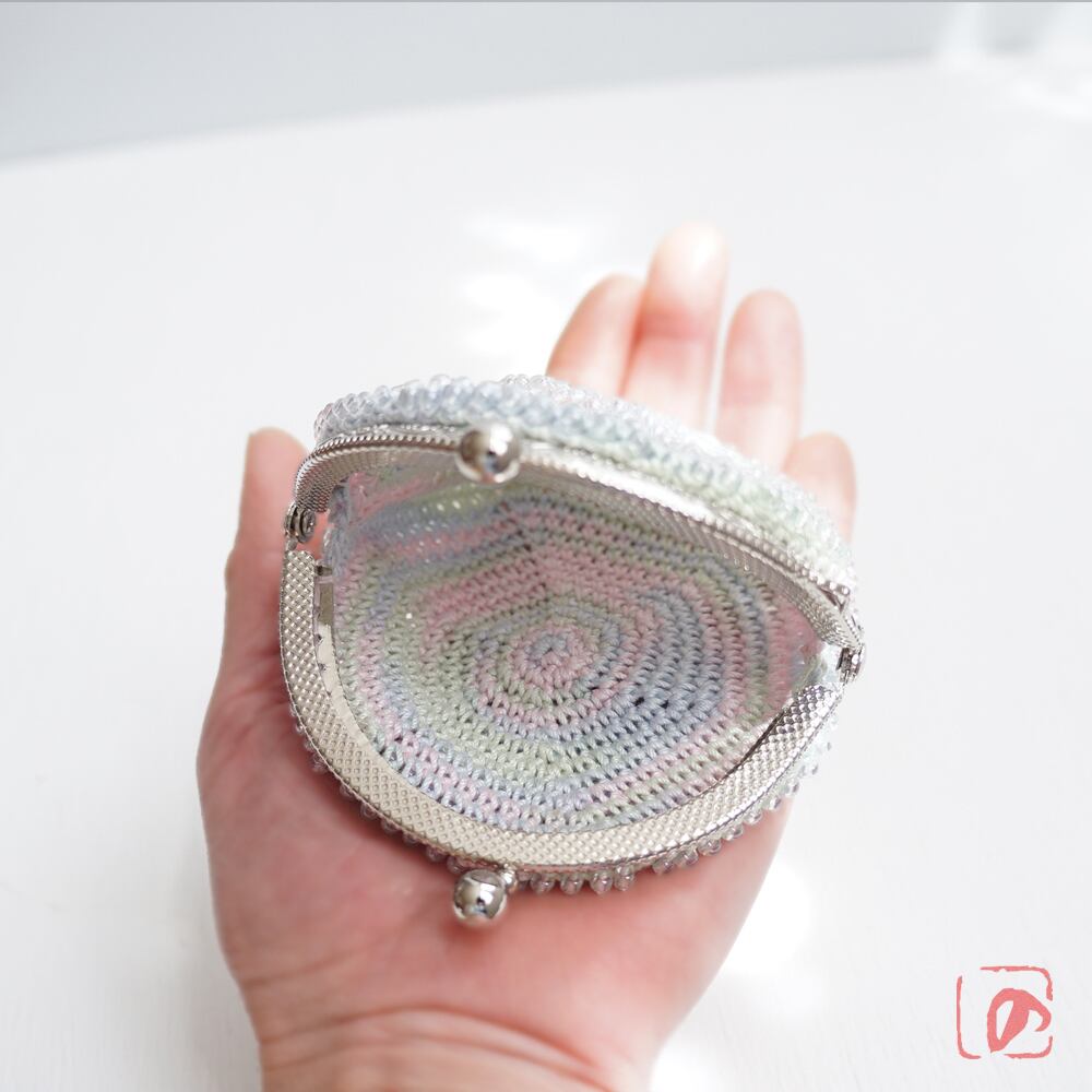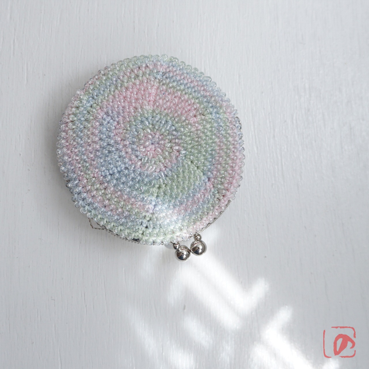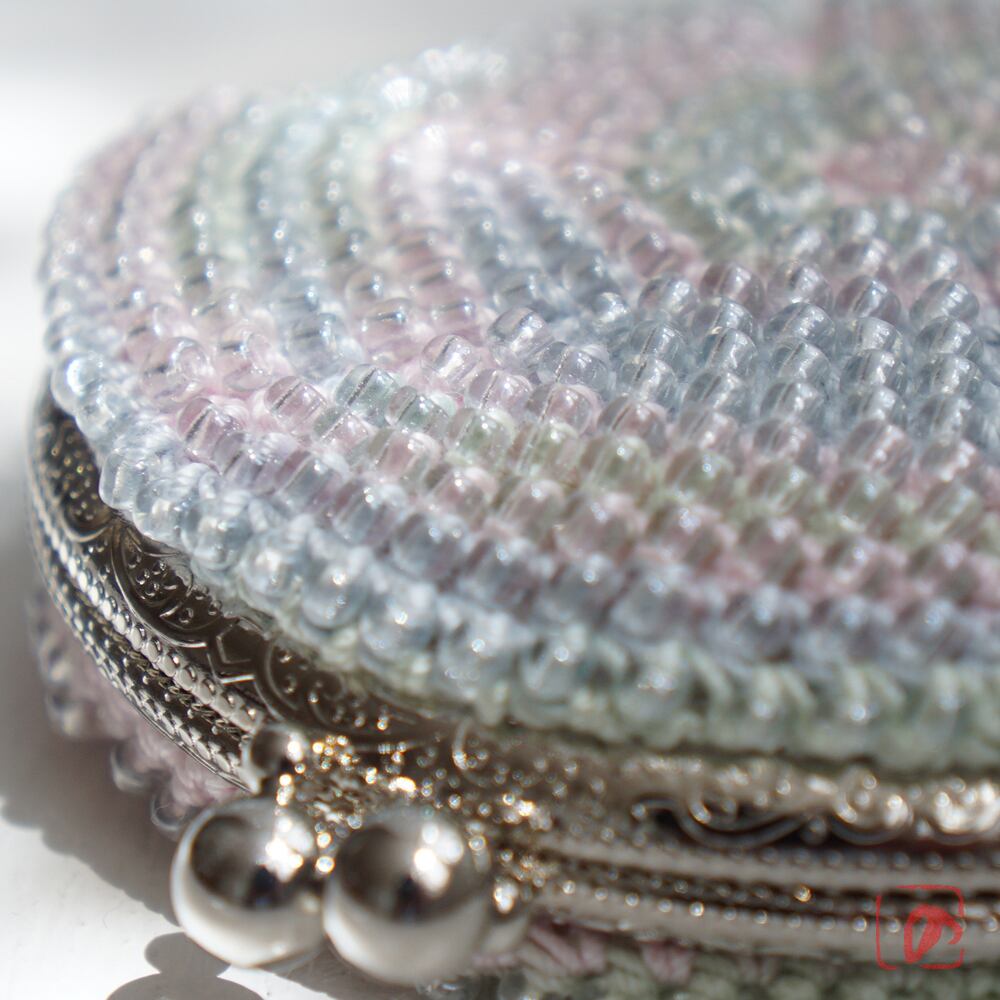 やさしい色合いの段染糸がクリアビーズに透けてキレイな編み地。
