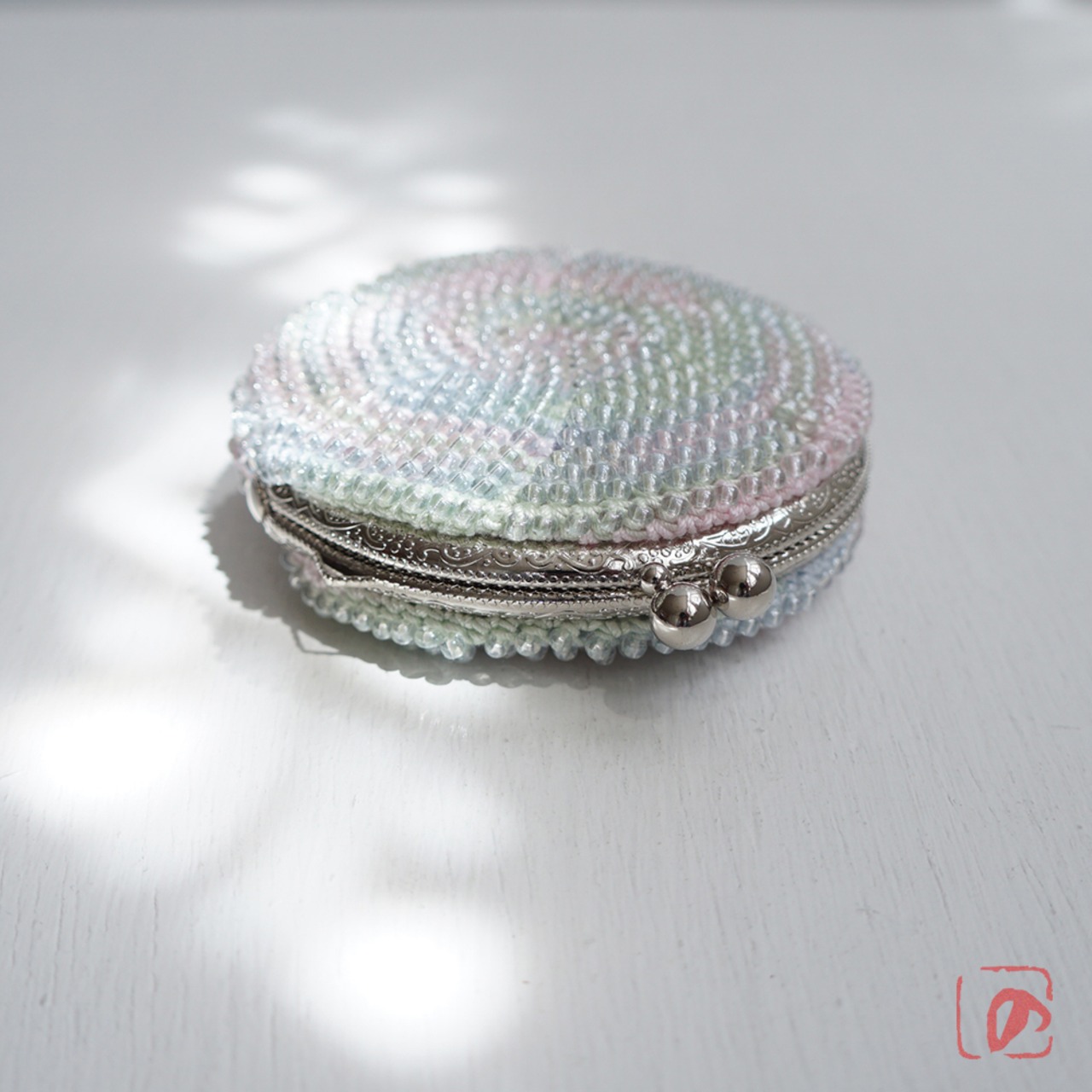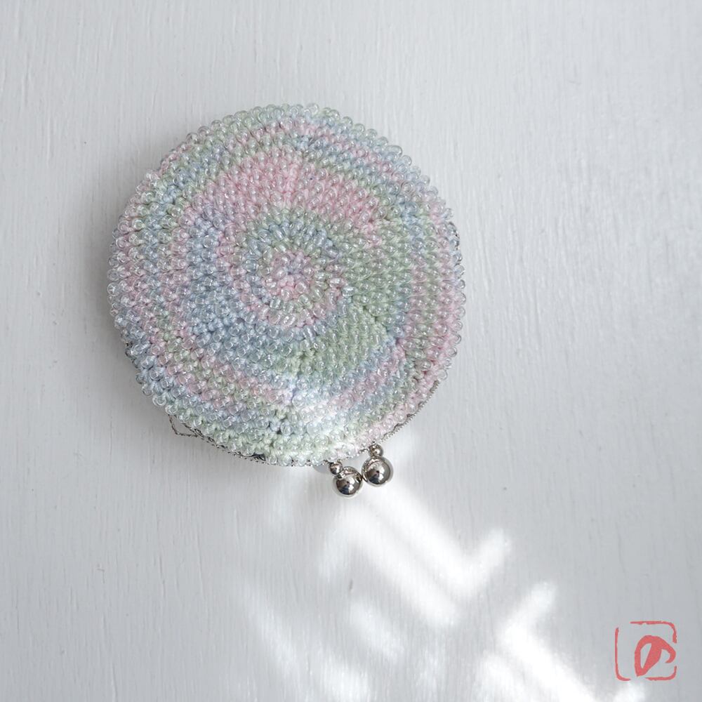 3mmのビーズをひとつぶづつ、まぁるい編み地全面に編み込みました。