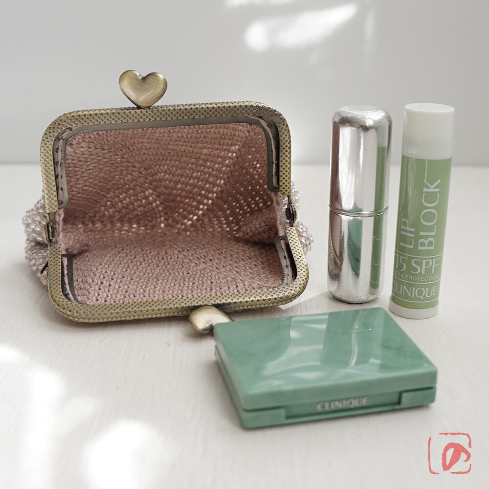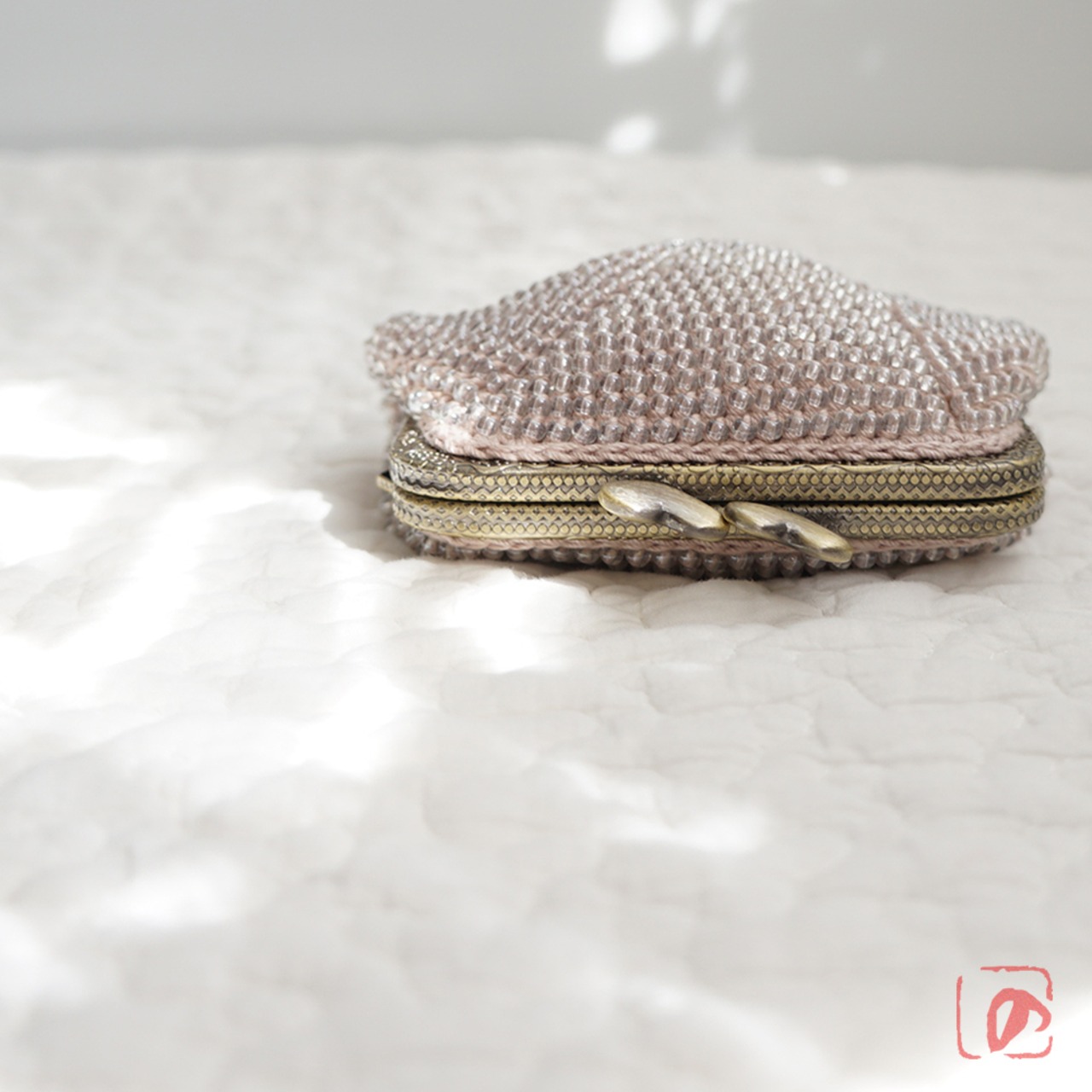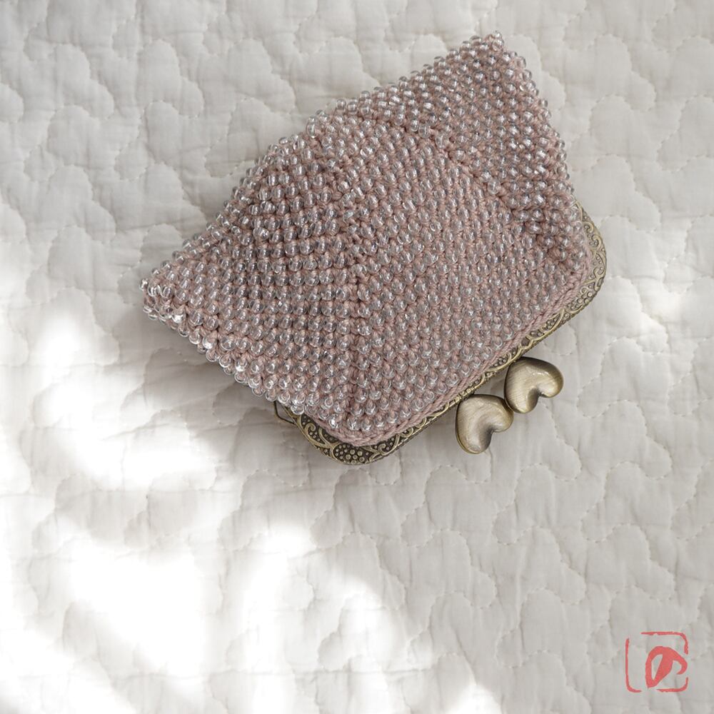 くすみピンクの編み地と♡ハートの口金を組み合わせてかわいらしく仕上げました。