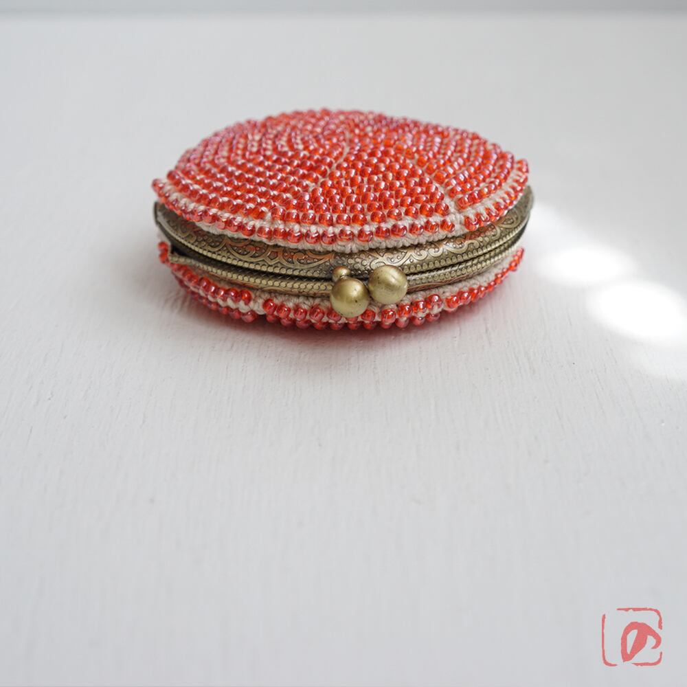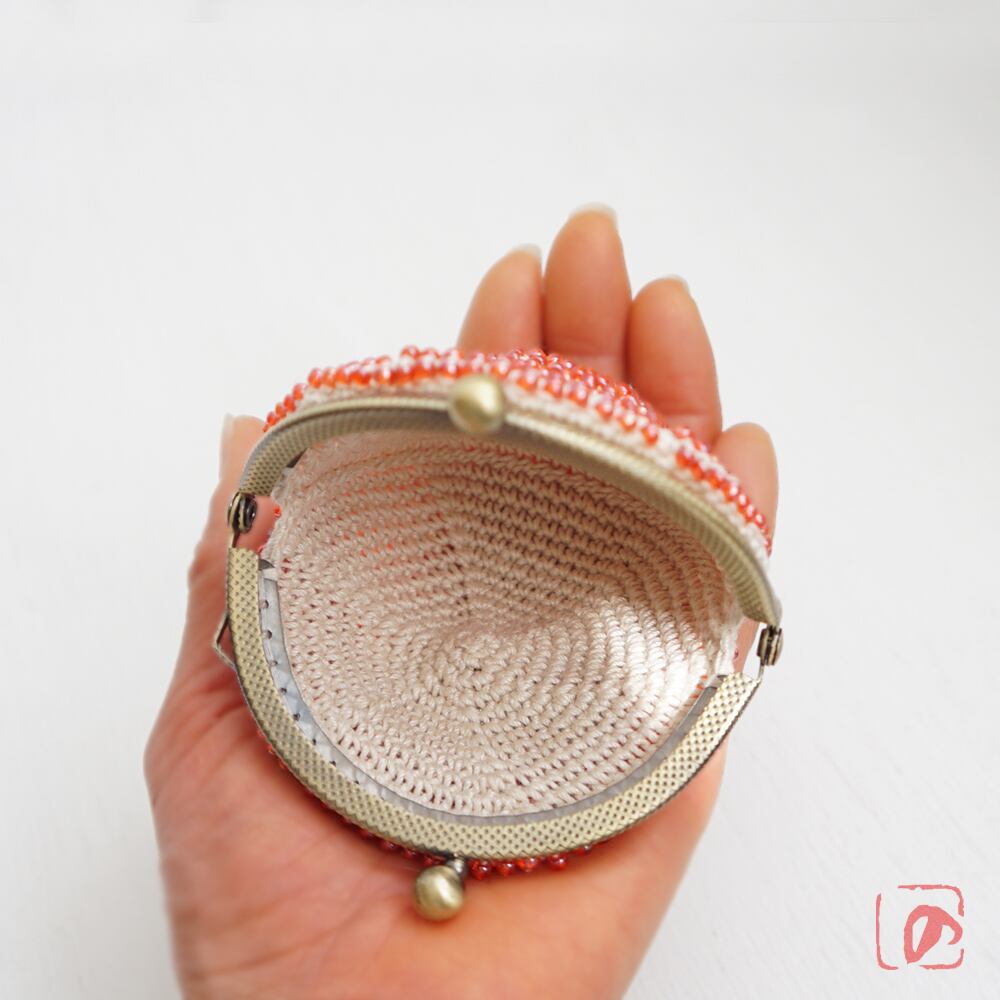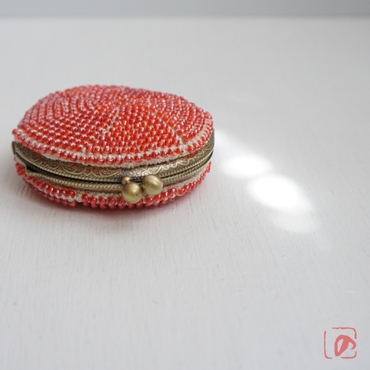 3mmのビーズをひとつぶづつ、まぁるい編み地全面に編み込みました。