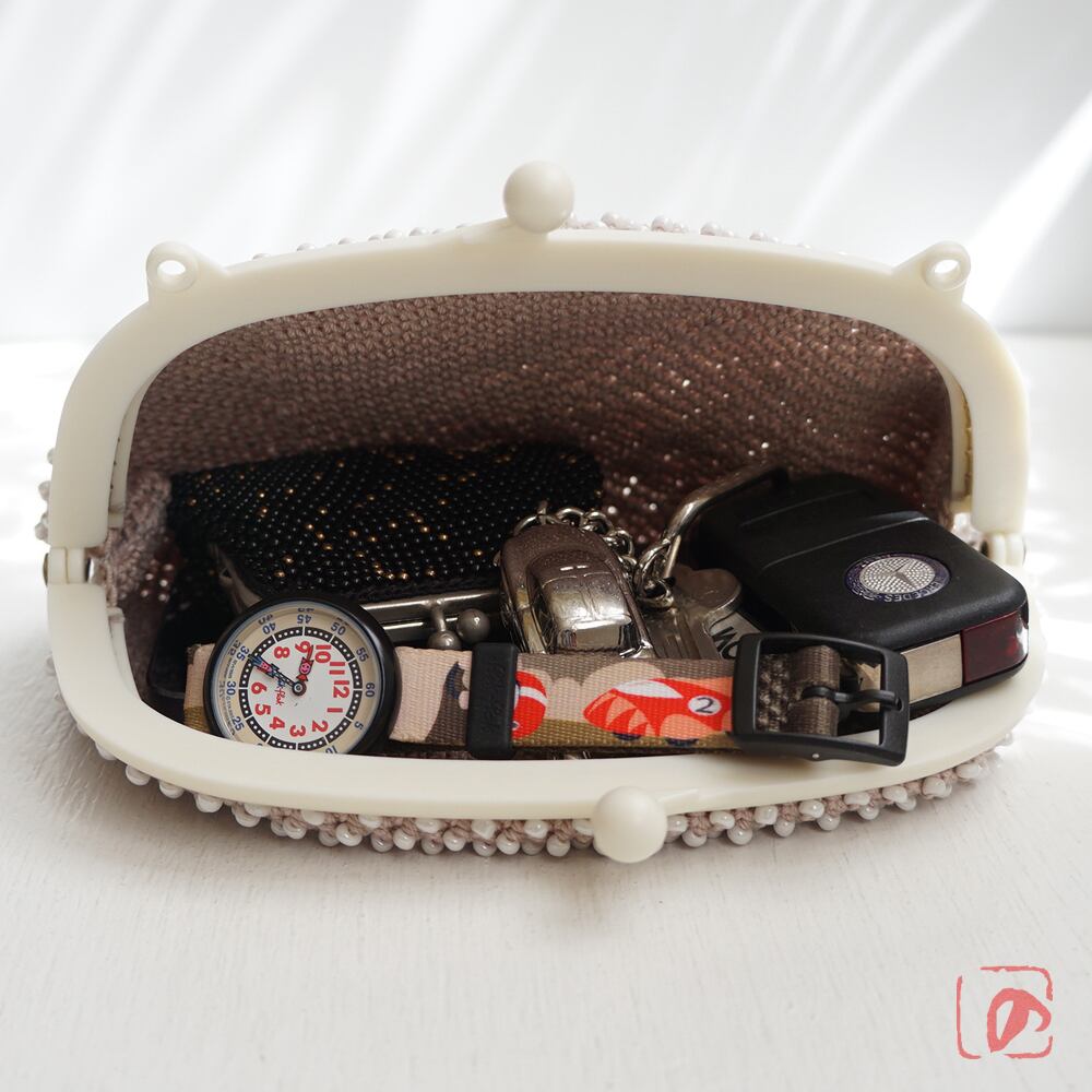 幅16cmのプラ口金を使い、収納力も余裕あり。