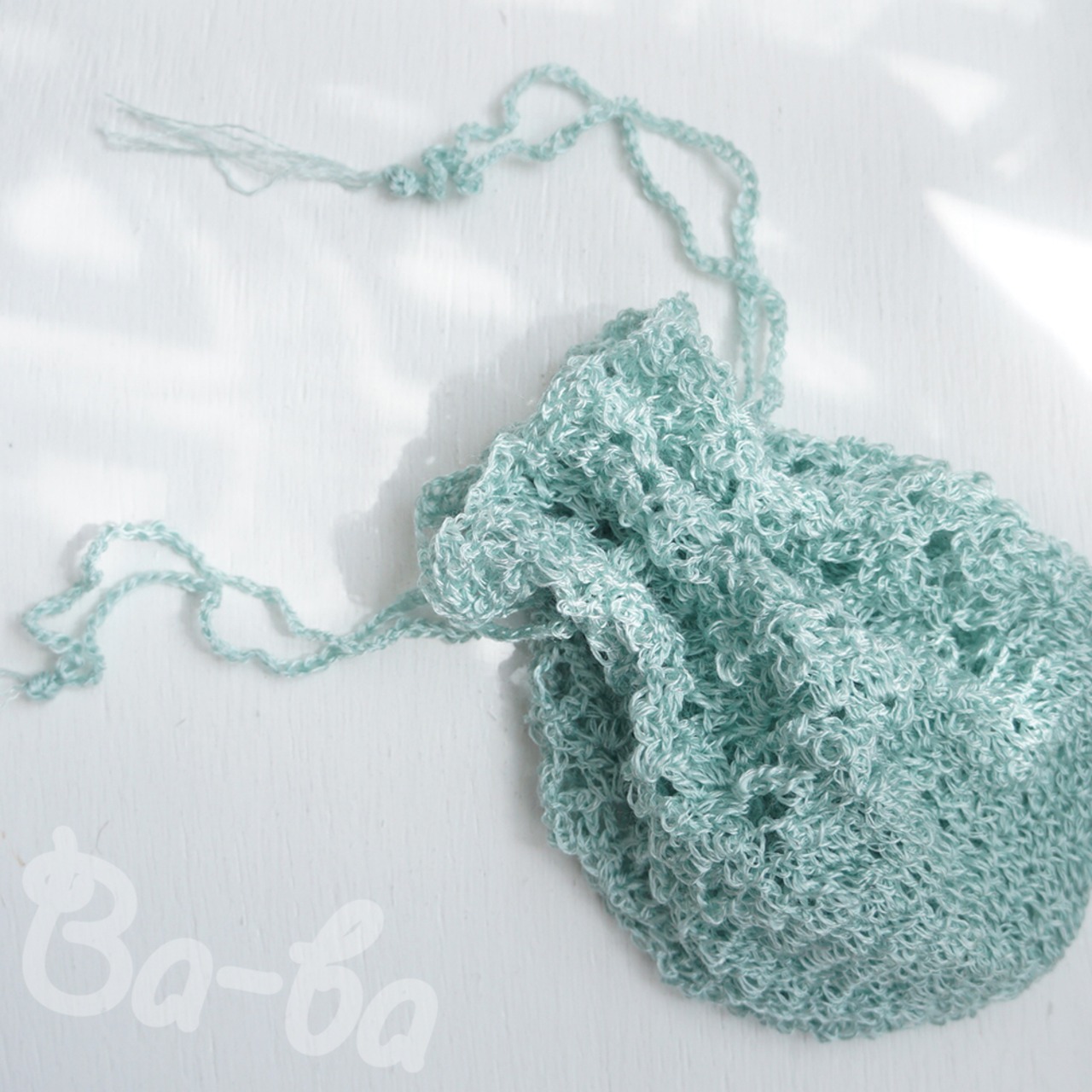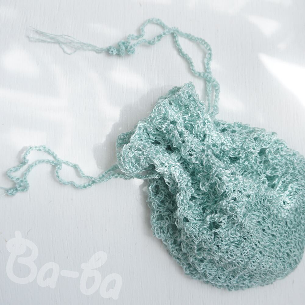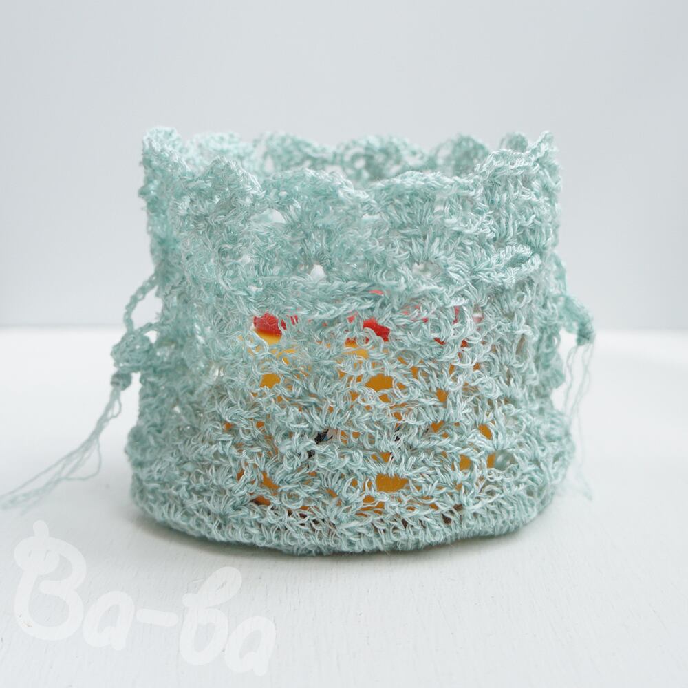 発色の美しい極細サマーヤーンを透かし編みの巾着に仕上げました。