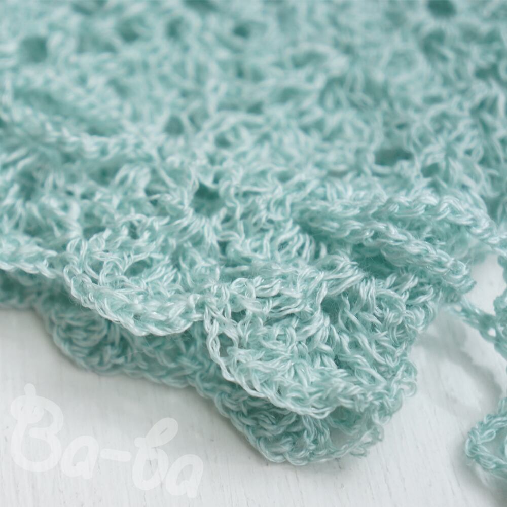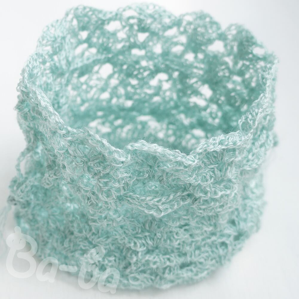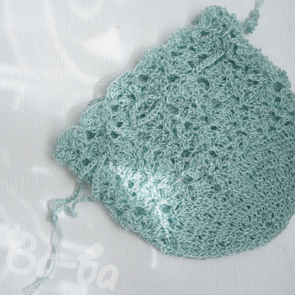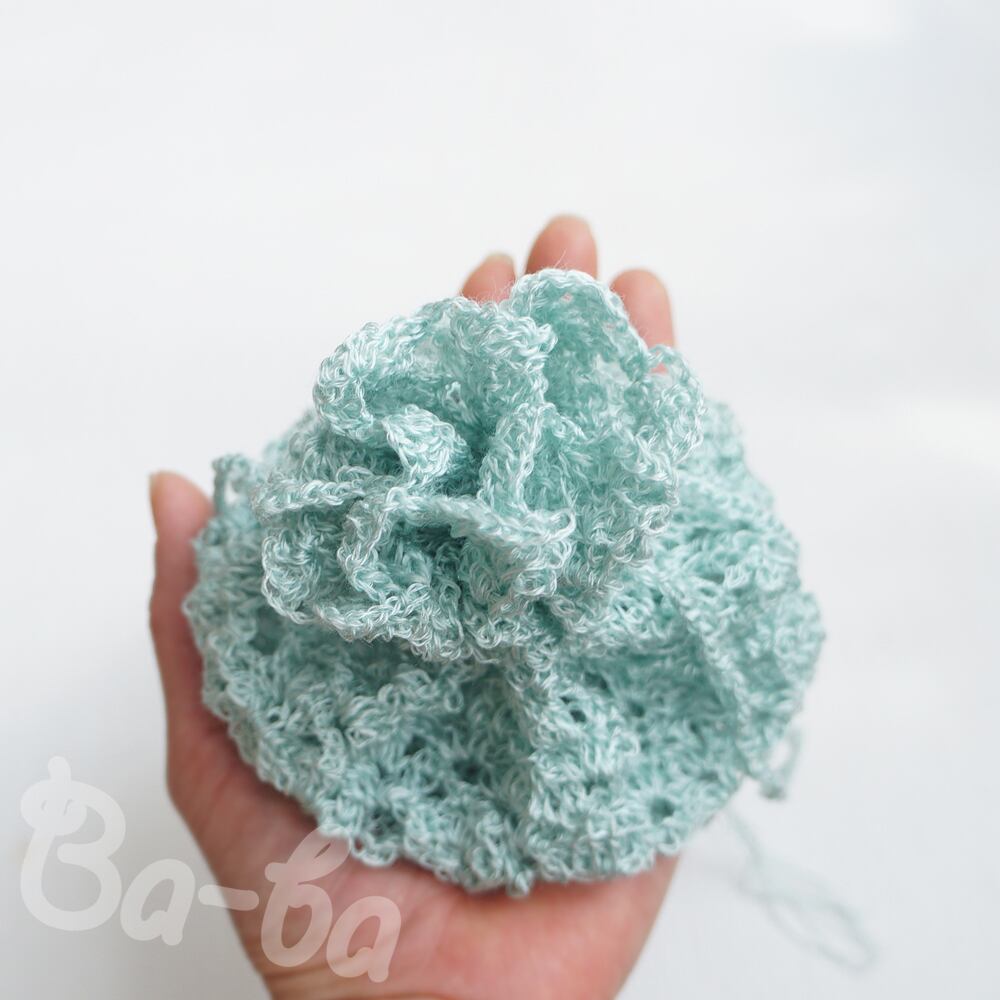 発色の美しい極細サマーヤーンを透かし編みの巾着に仕上げました。