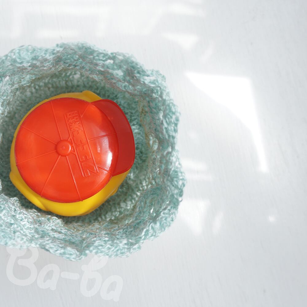 キュっとしぼる紐も、本体と同じ糸を使用して作っています。