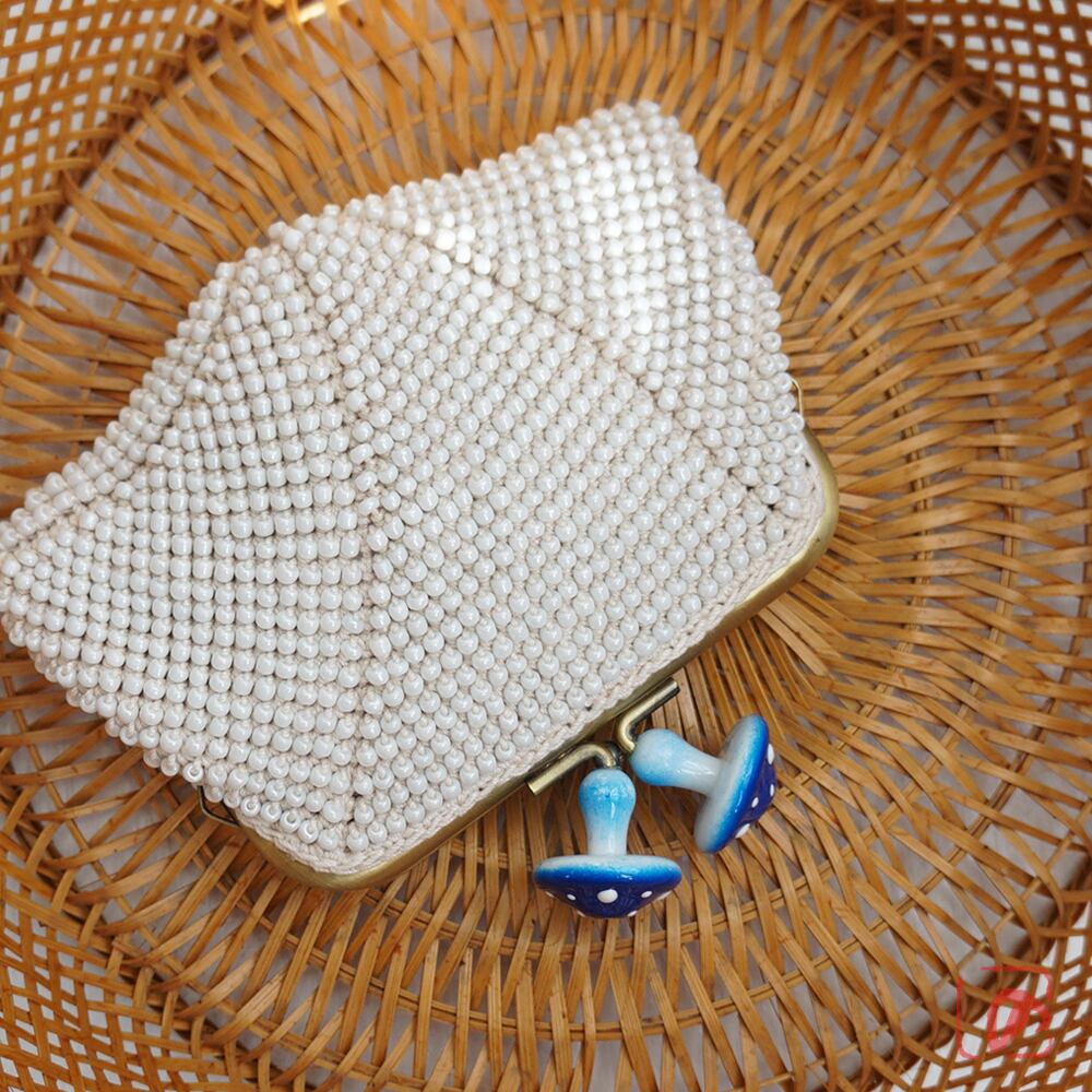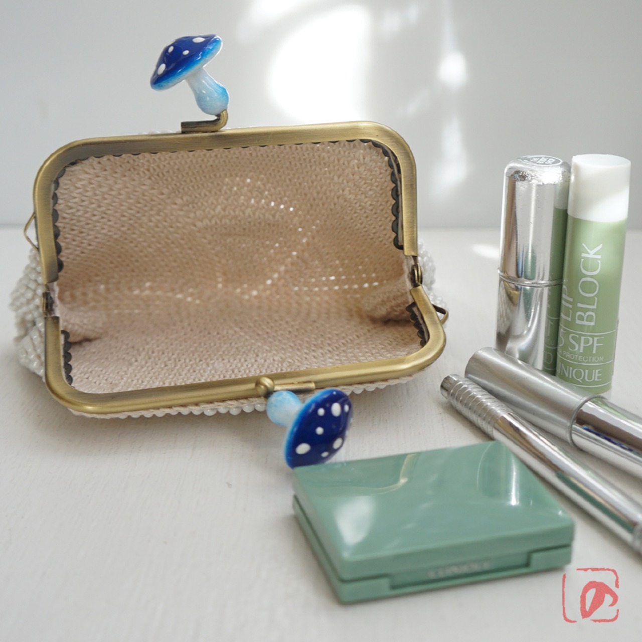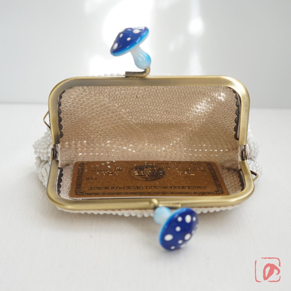 ばあば、大きめ・総ガラスビーズのスクエアがま口(青きのこ・2205)