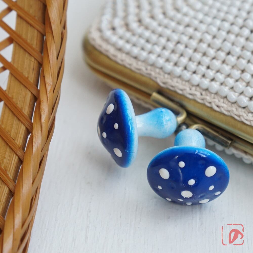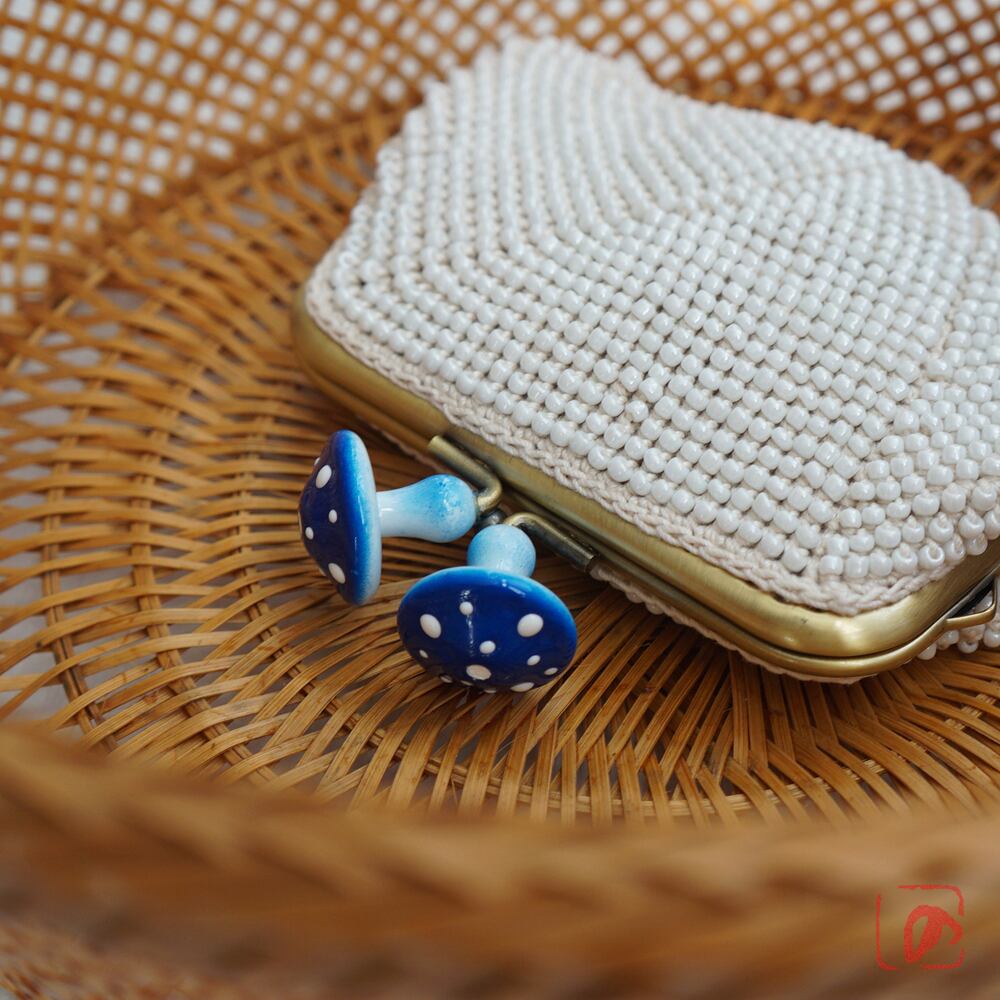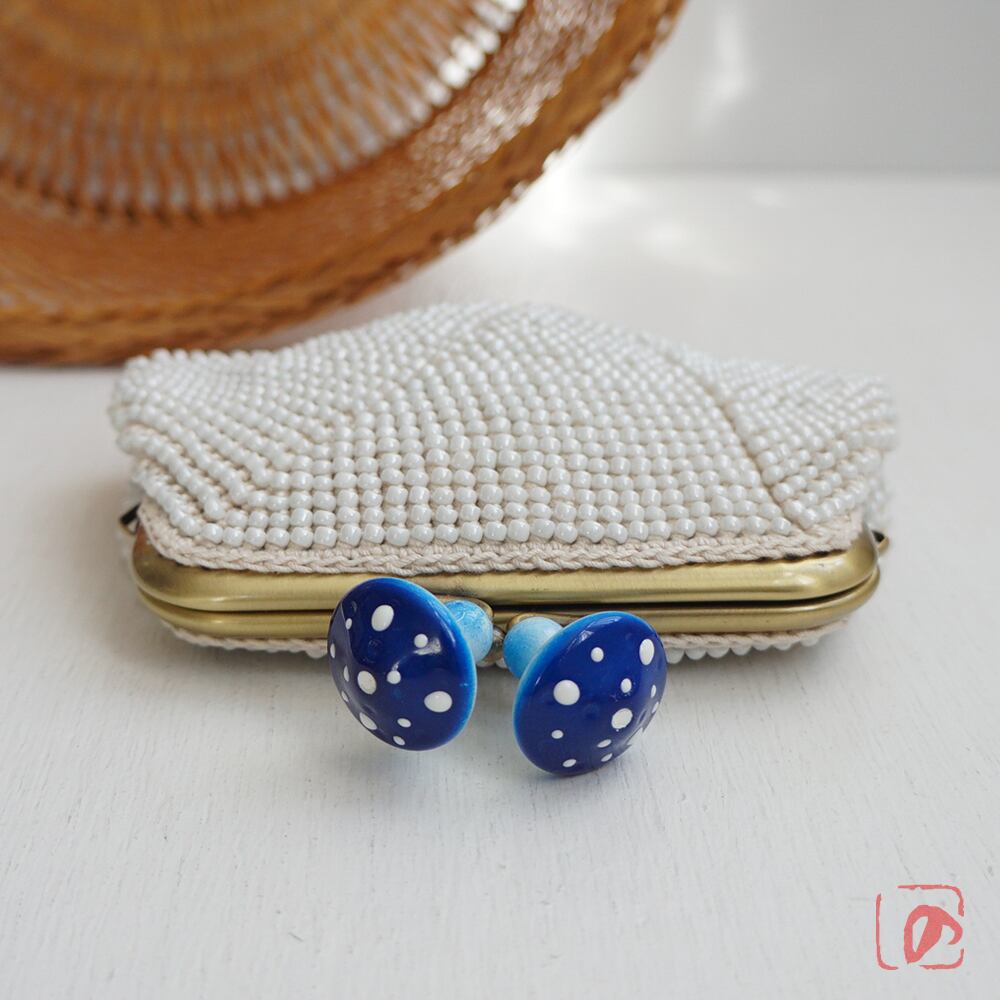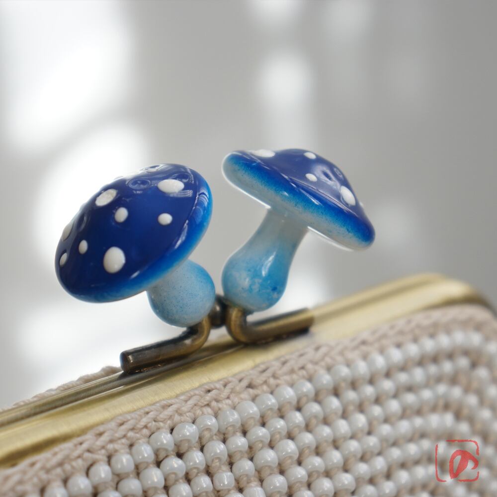 ばあば、大きめ・総ガラスビーズのスクエアがま口(青きのこ・2205)