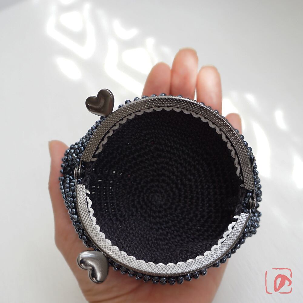 口金 : メタルブラック、ななめハートつまみ、8.5cm、丸型、片カン
