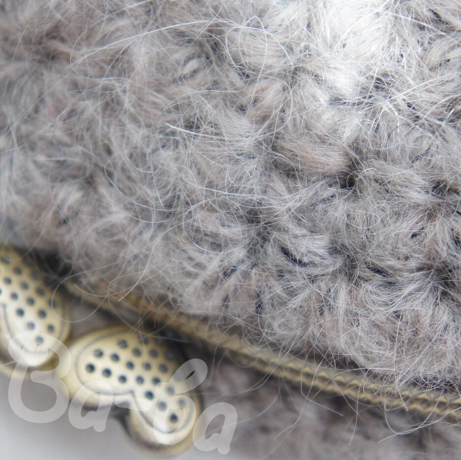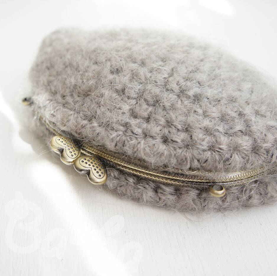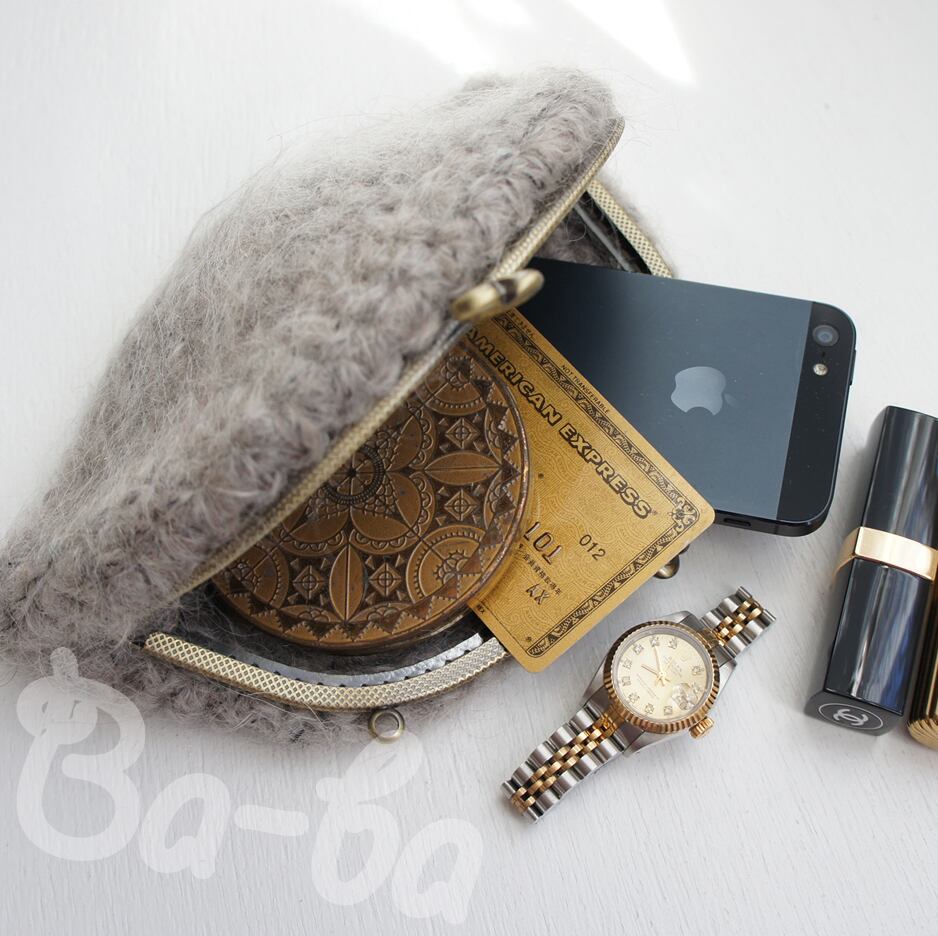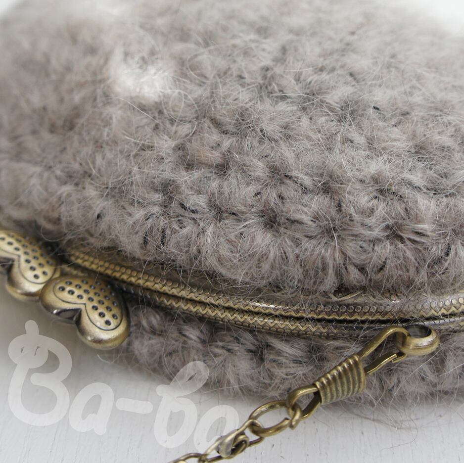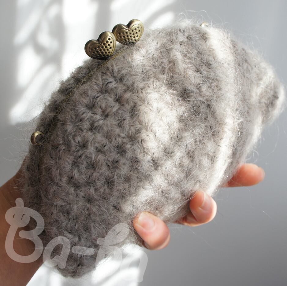 毛足の長いふわっふわモヘヤの編み地に、ハートの口金をつけてみました。