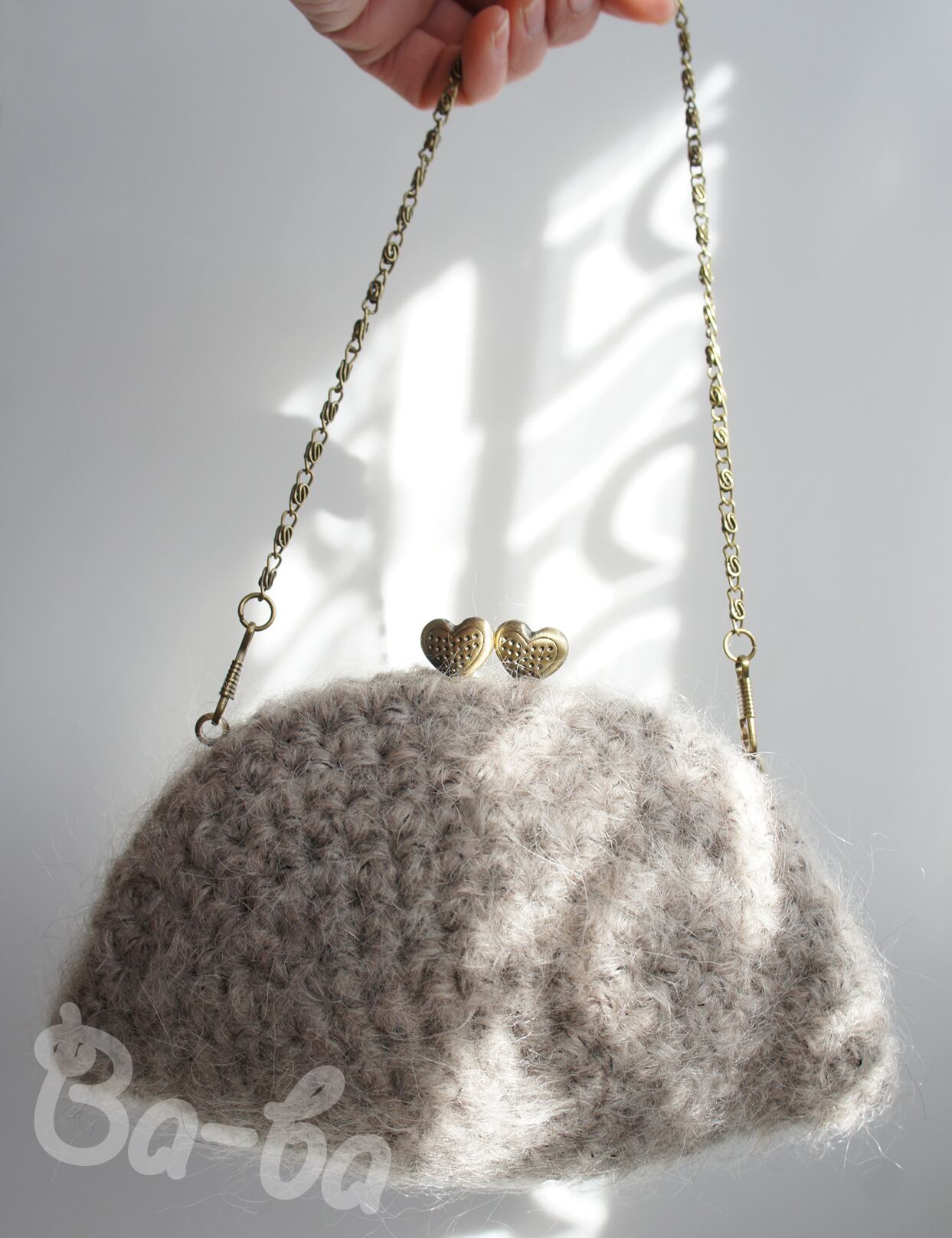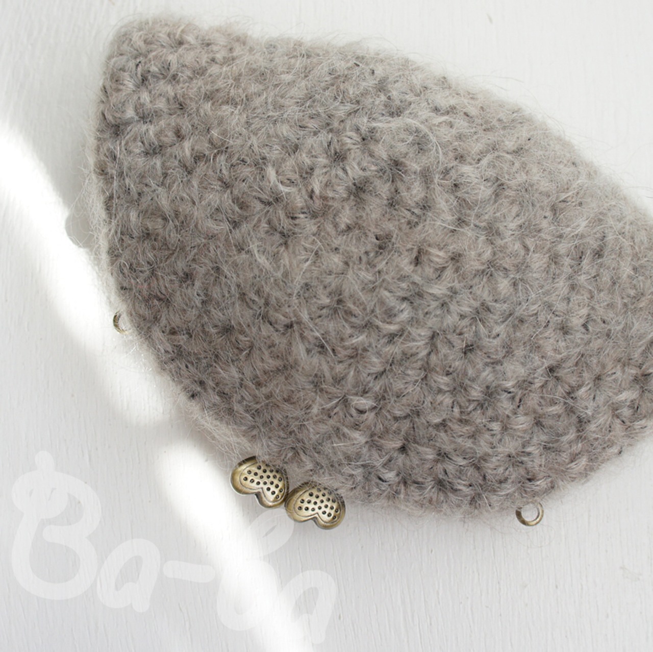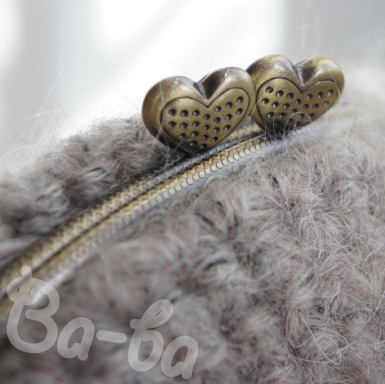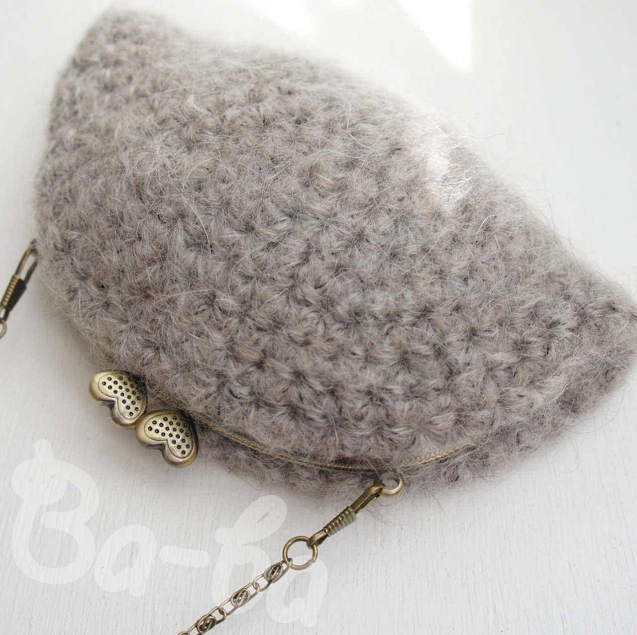 毛足の長いふわっふわモヘヤの編み地に、ハートの口金をつけてみました。