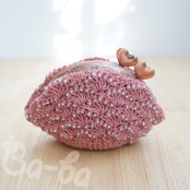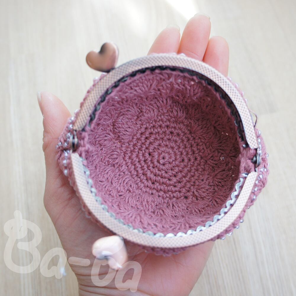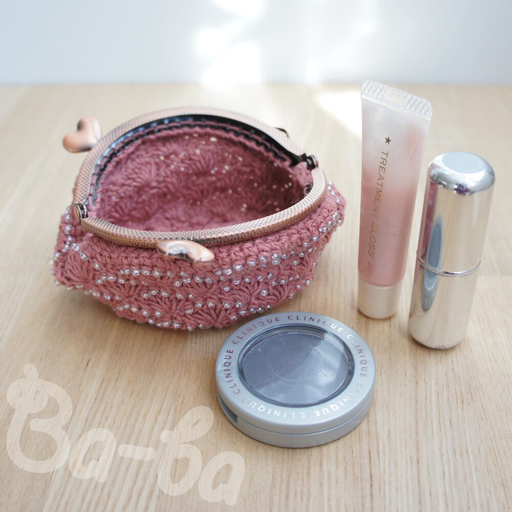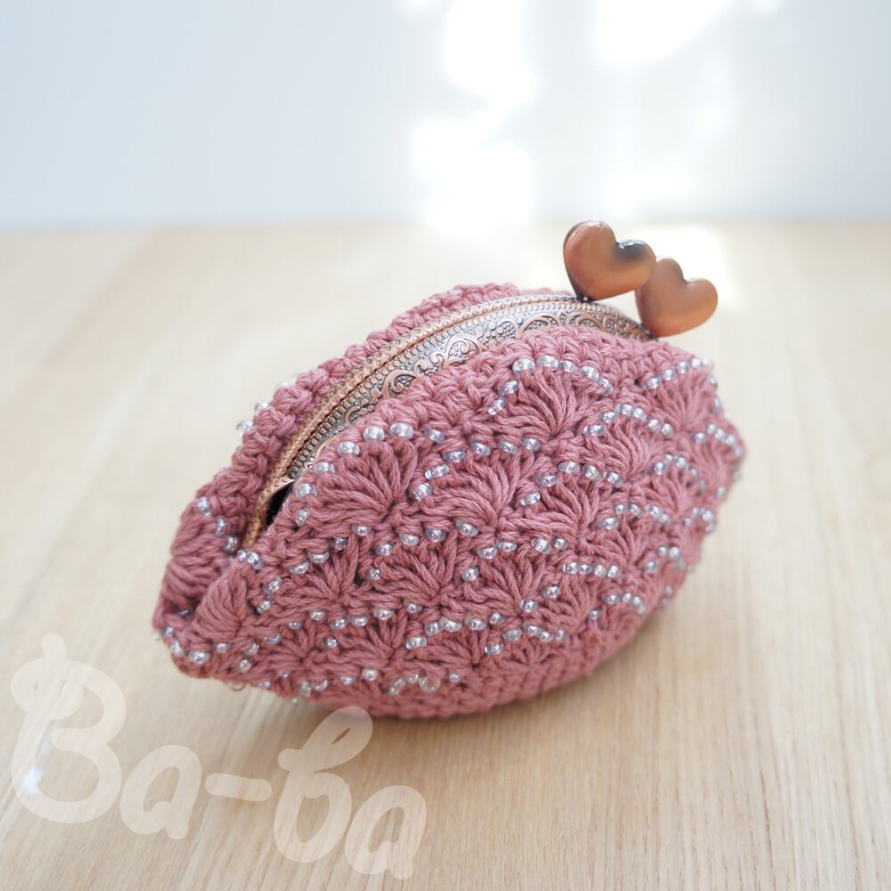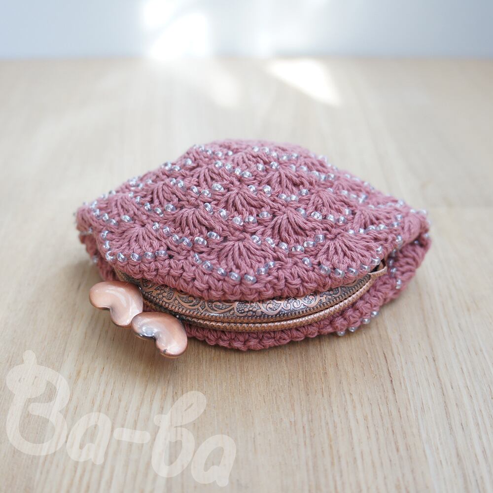 ばあば作、ビーズ入り松編みのがま口(ピンク・C1067)