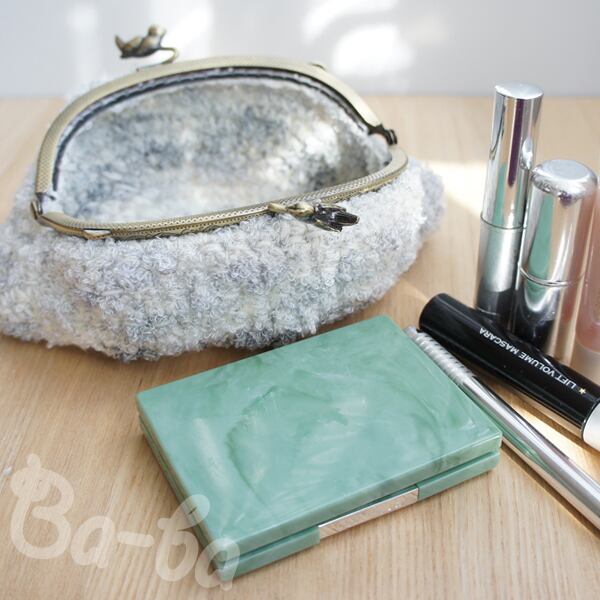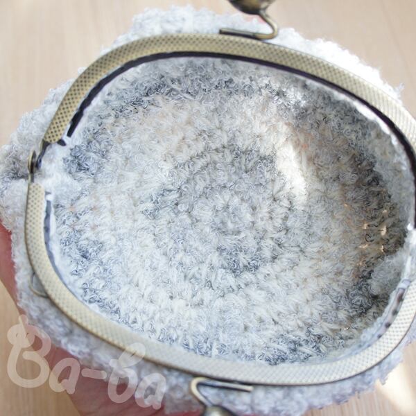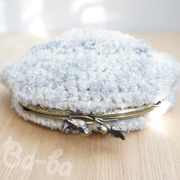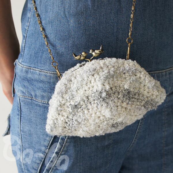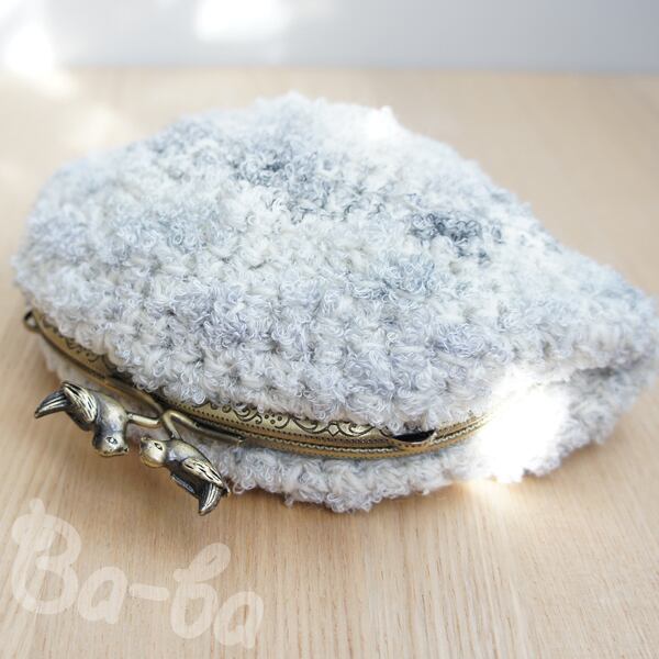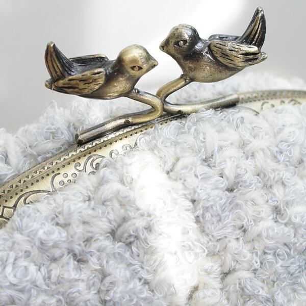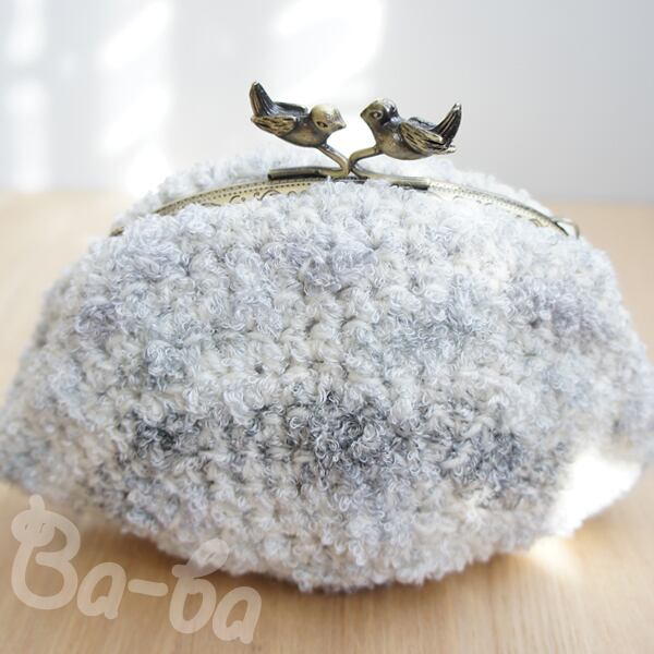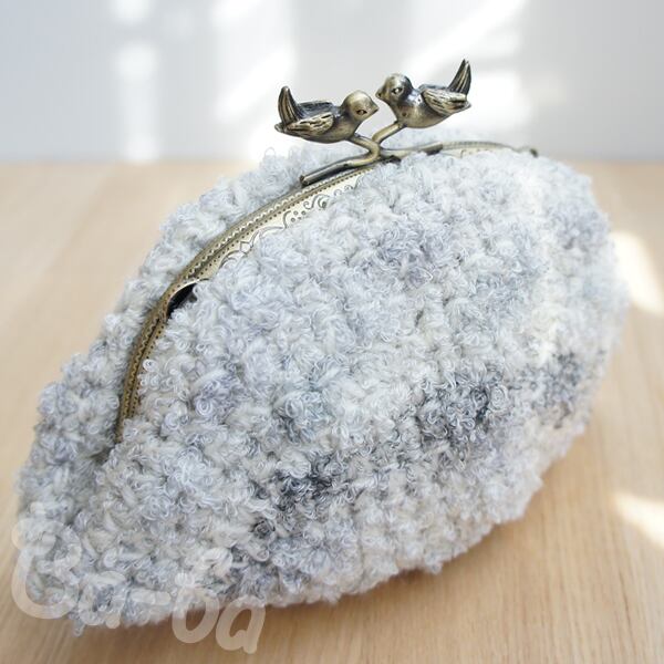 やさしい雲色のふわふわ毛糸をふんわりと編み上げ、小鳥の口金と組み合わせました。