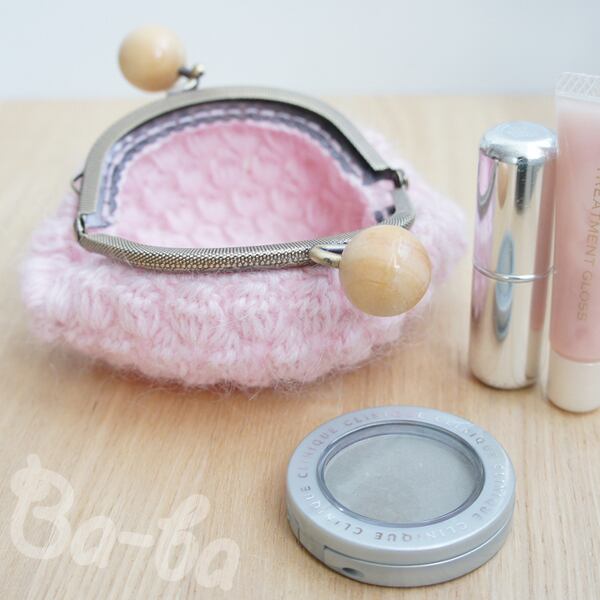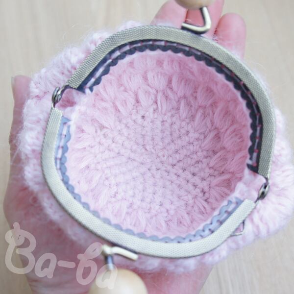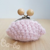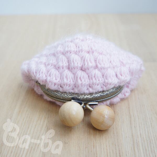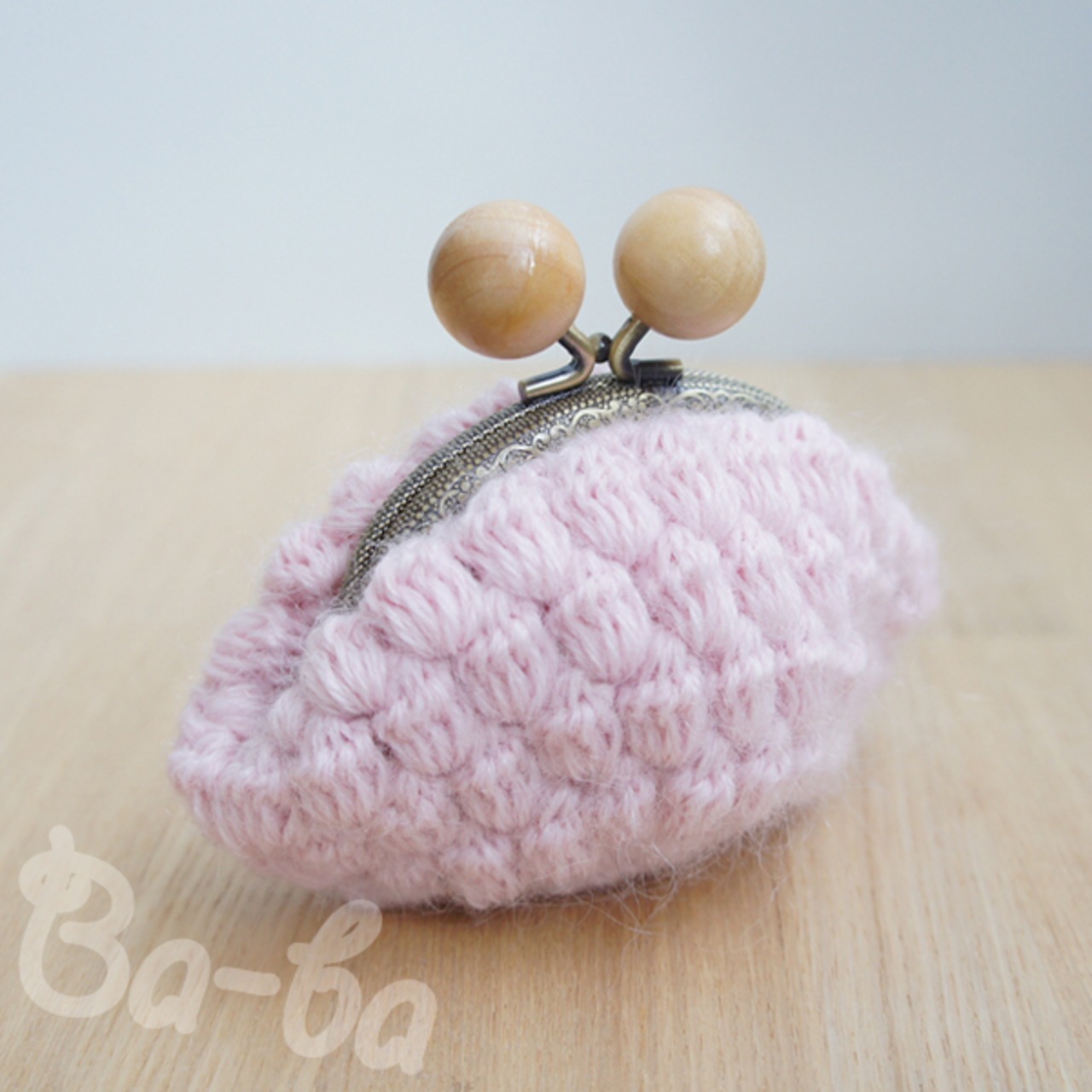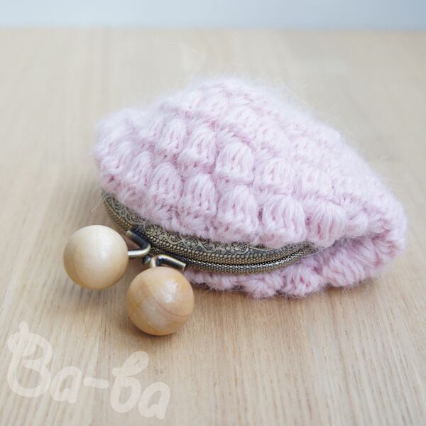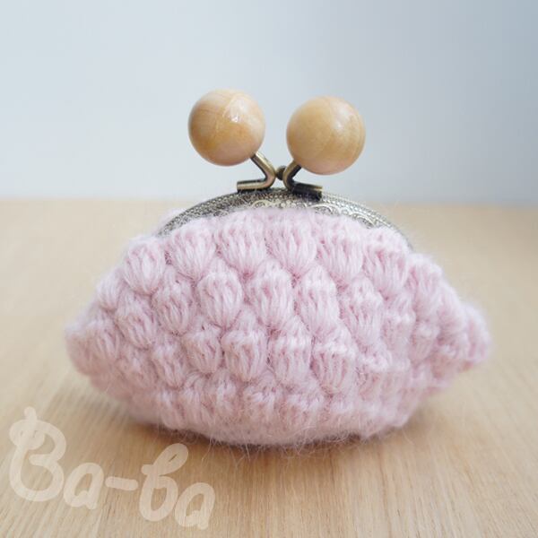 やさしいピンクのモヘヤ毛糸をぽこぽことした「玉編み」で編み上げ、がま口に仕上げました。
