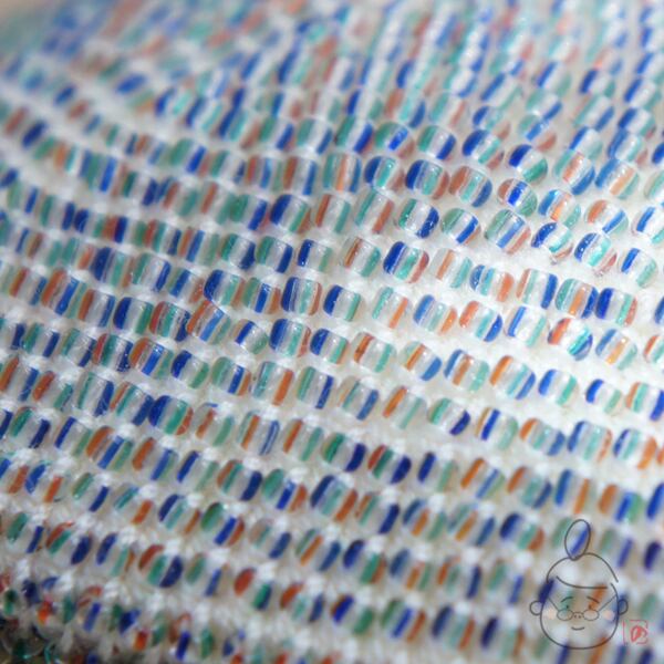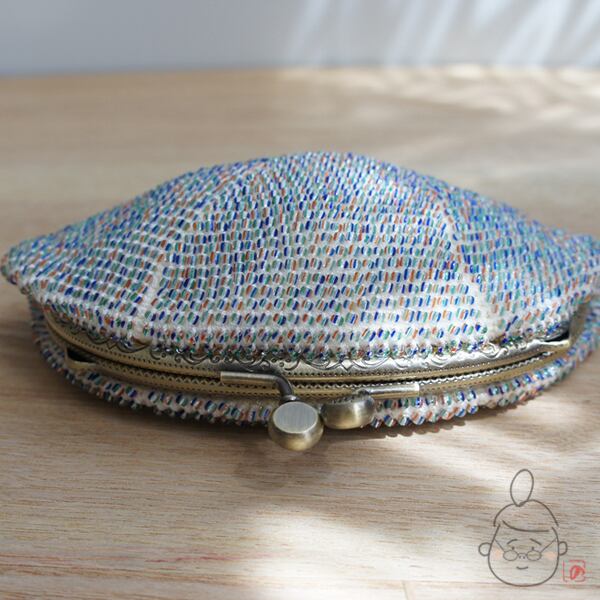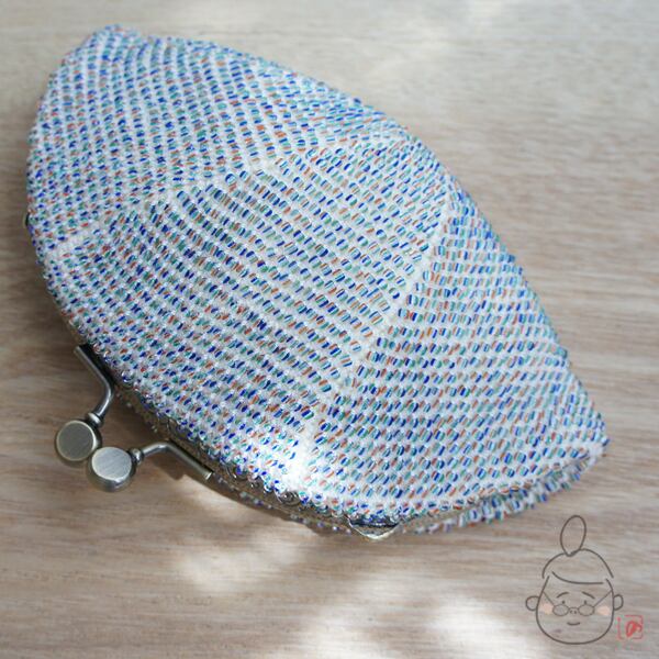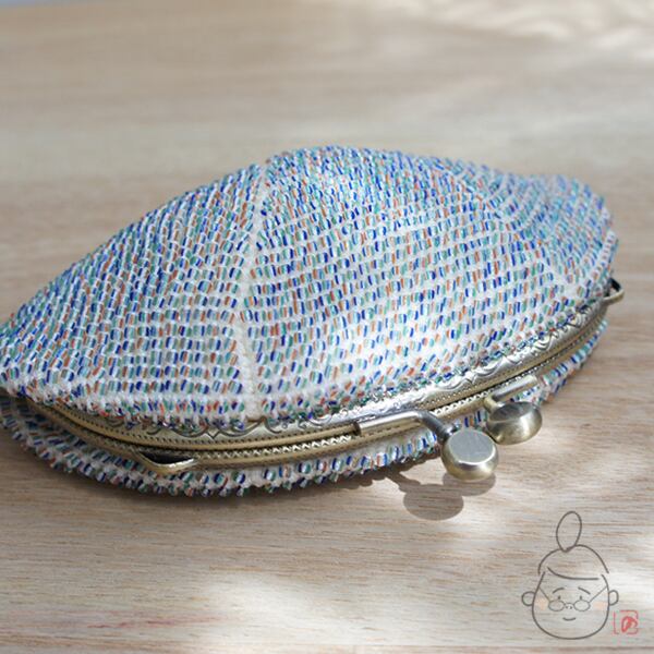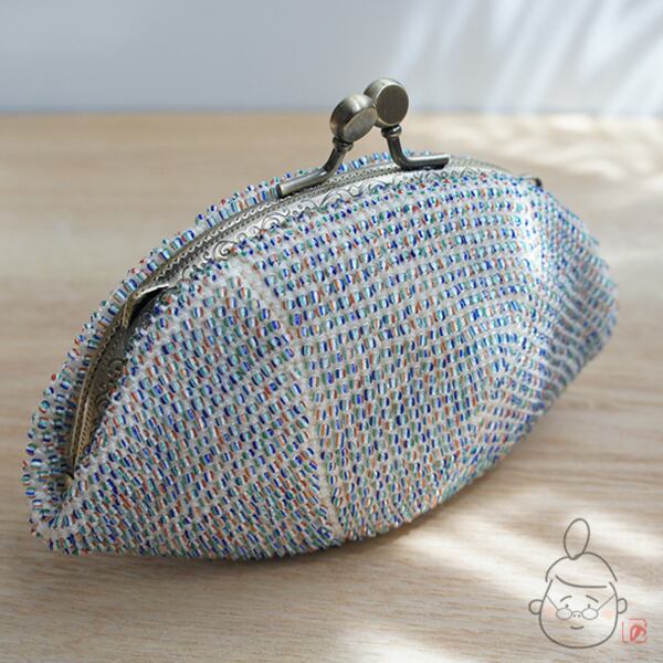よーく見ると青、赤、緑が一粒に詰まったジードビーズをひとつぶづつ編み込んだ、上質ながま口です。