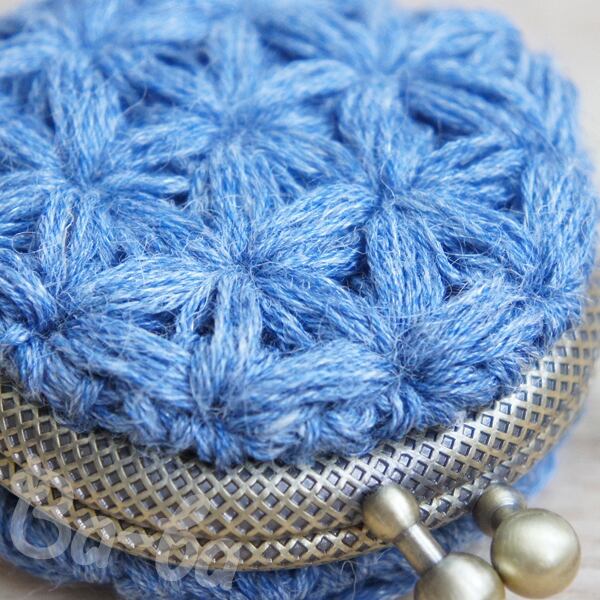 淡いブルーのサマーヤーンで、ふんわりリフ編みのがま口を作りました。