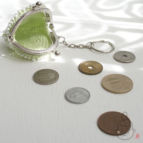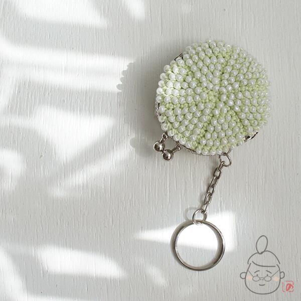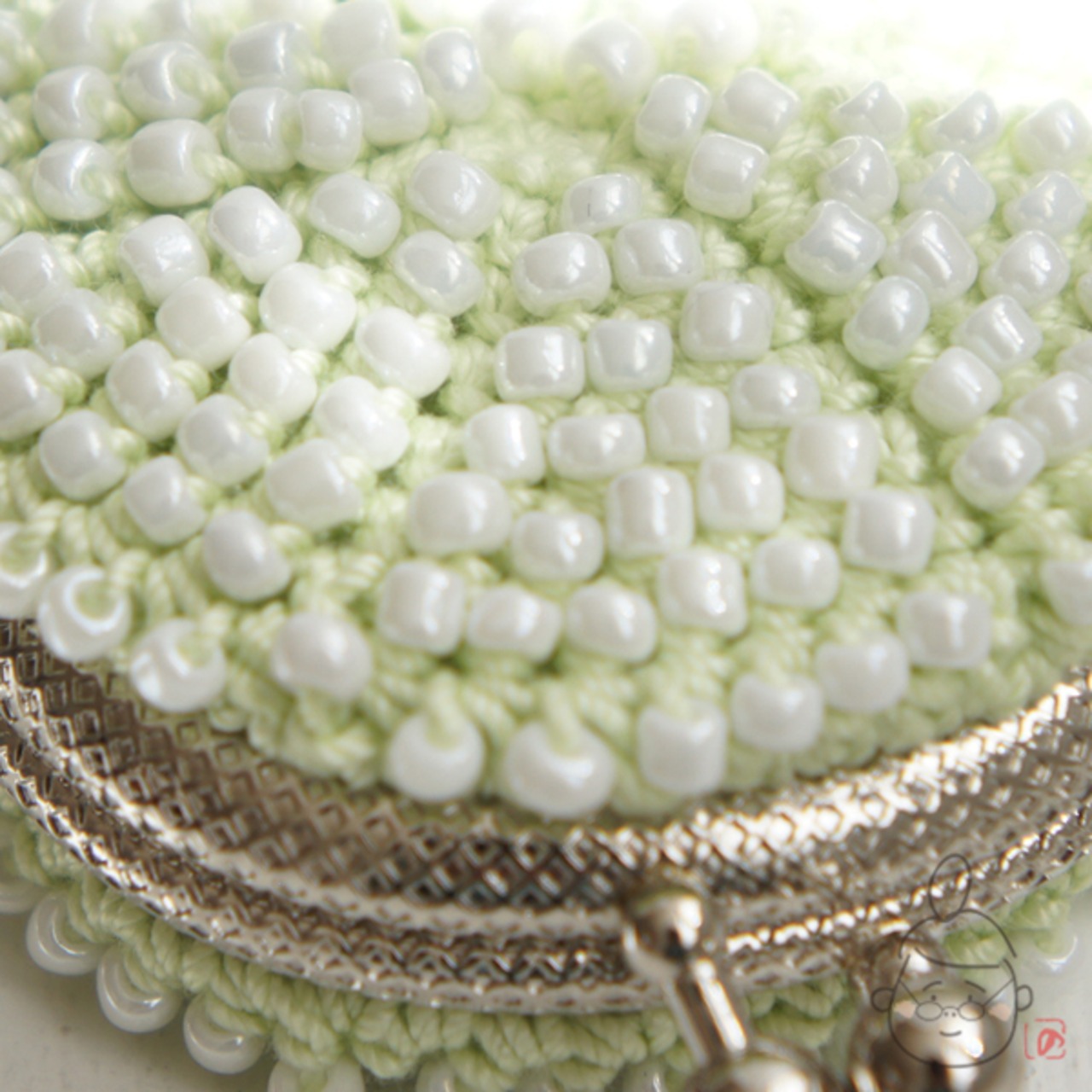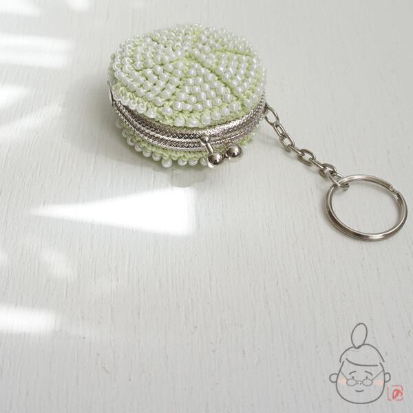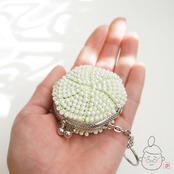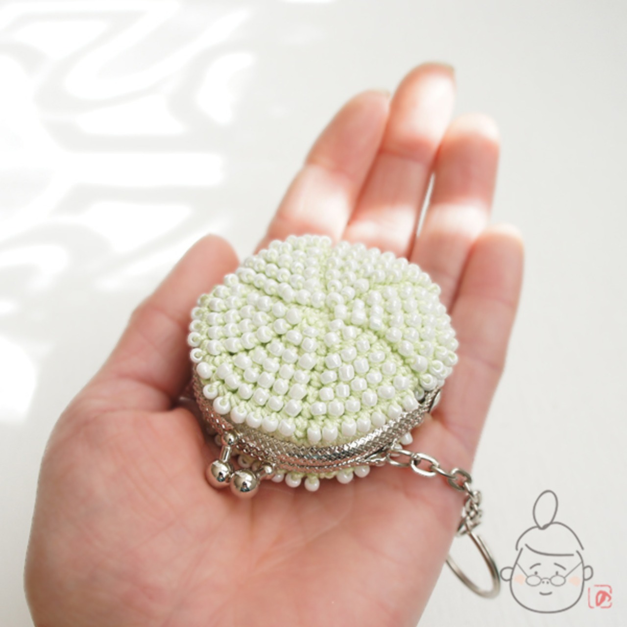 キラキラのガラスビーズをひとつぶづつ編み込んだ「ちびまる」がま口です。