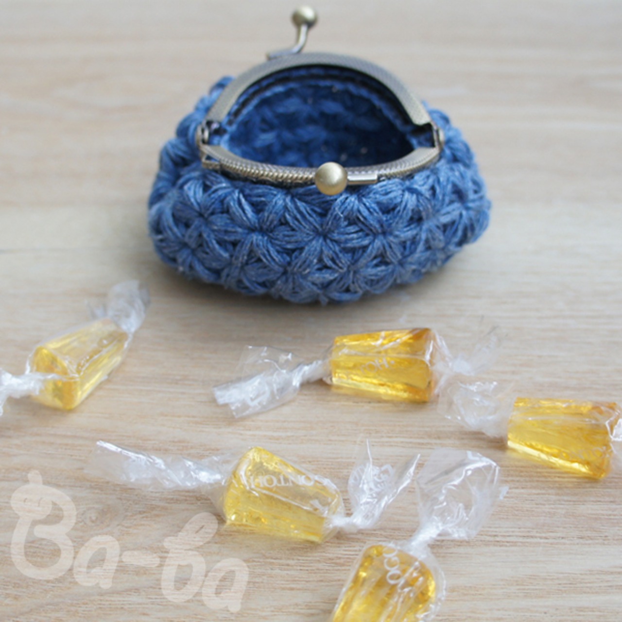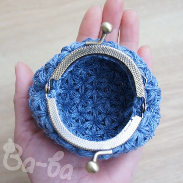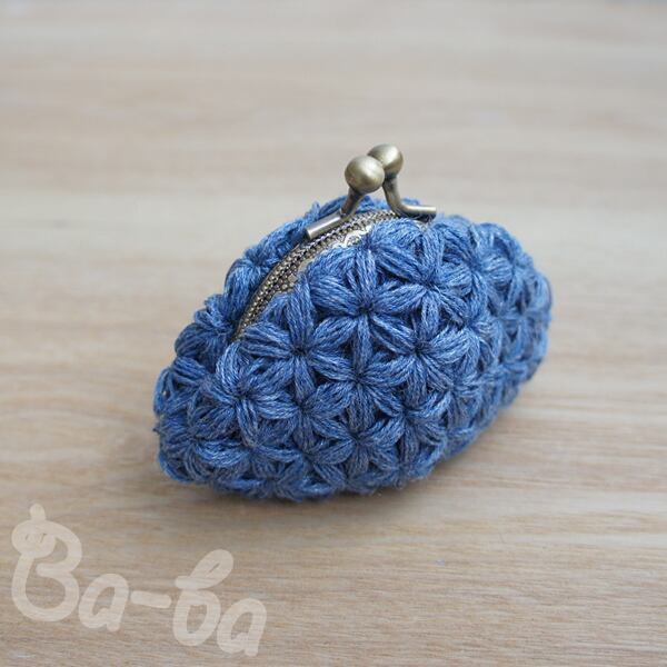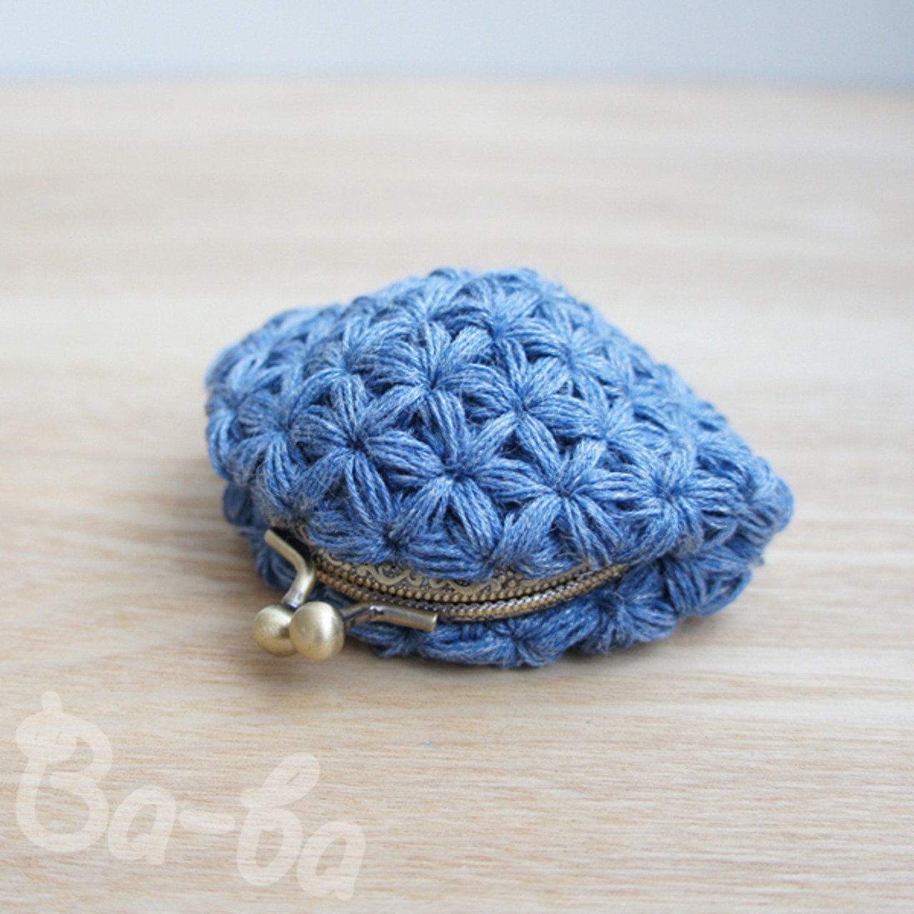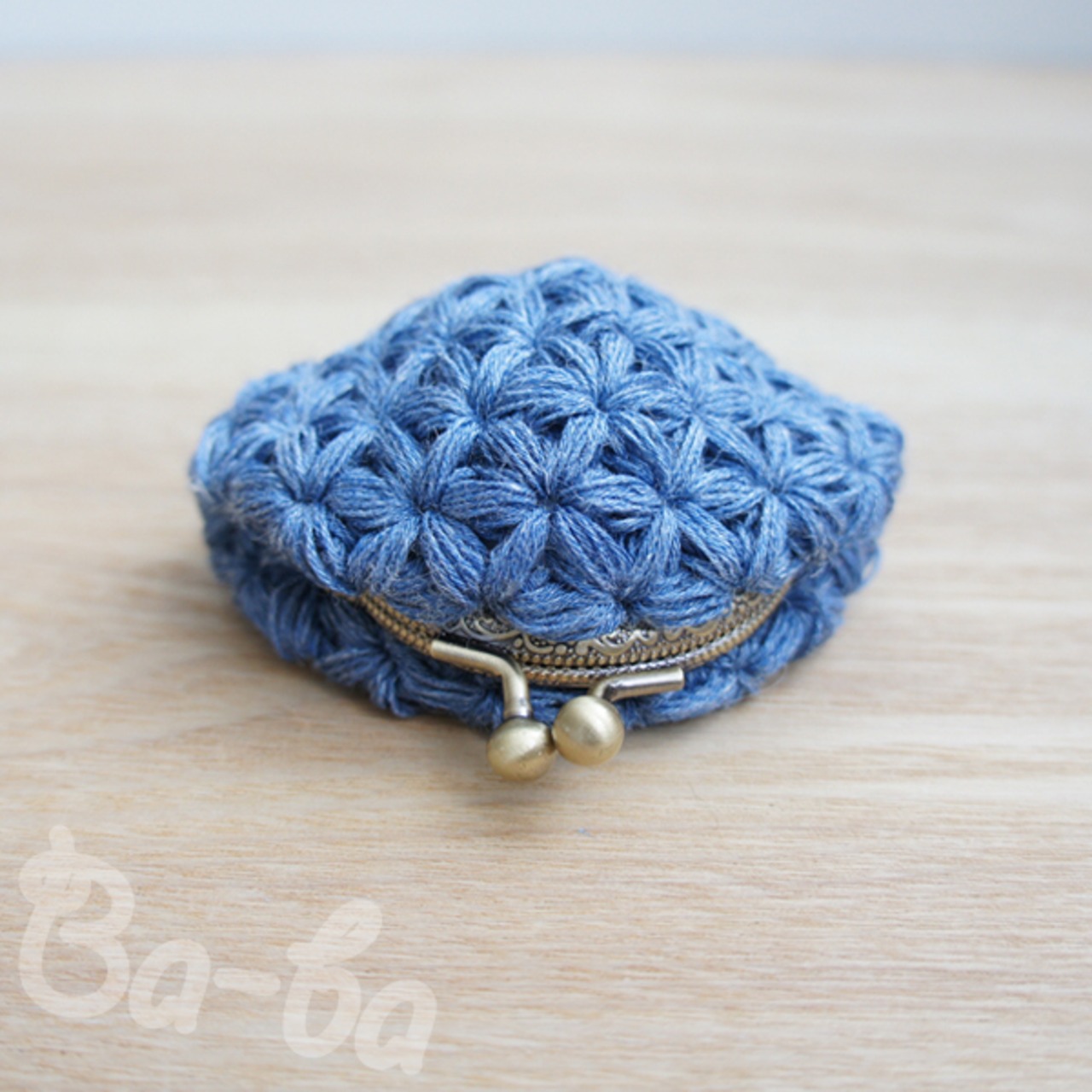 やさしいブルーの夏糸で、ふんわりリフ編みのがま口を作りました。