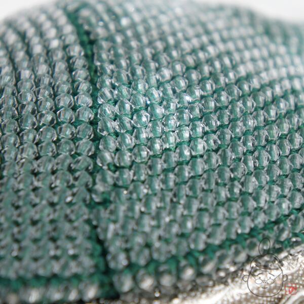 編み地と色を合わせたクリアグリーンのつまみがアクセント♪