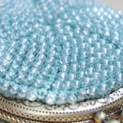 ガラスビーズを一粒づつ編み込んだ円形の編み地を2枚重ねて、まあるく仕上げました。