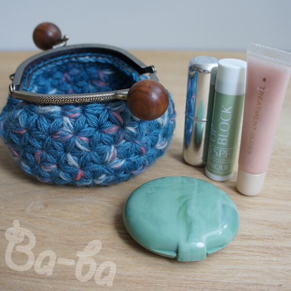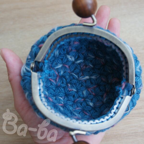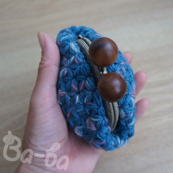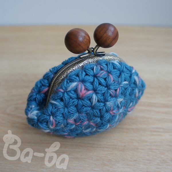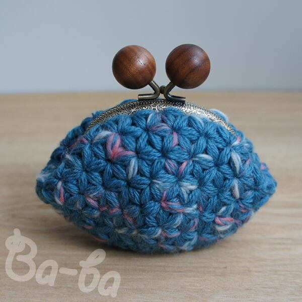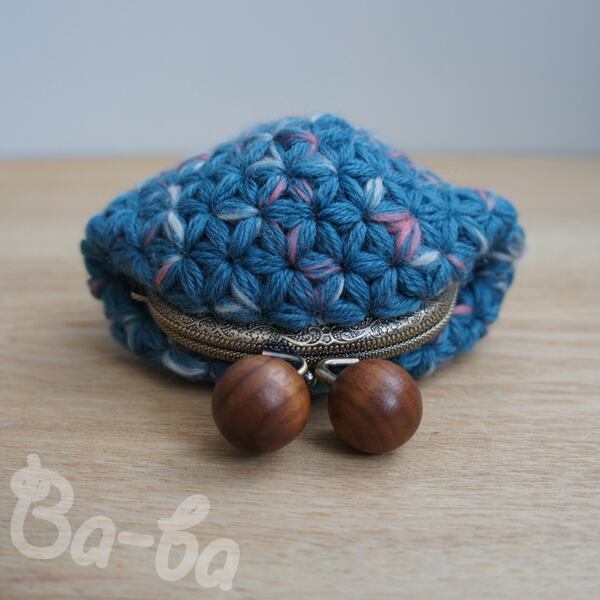 ばあば作♪リフ編みふわっとwoodyがま口(blue・C1268)