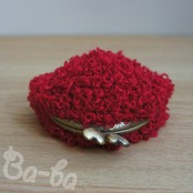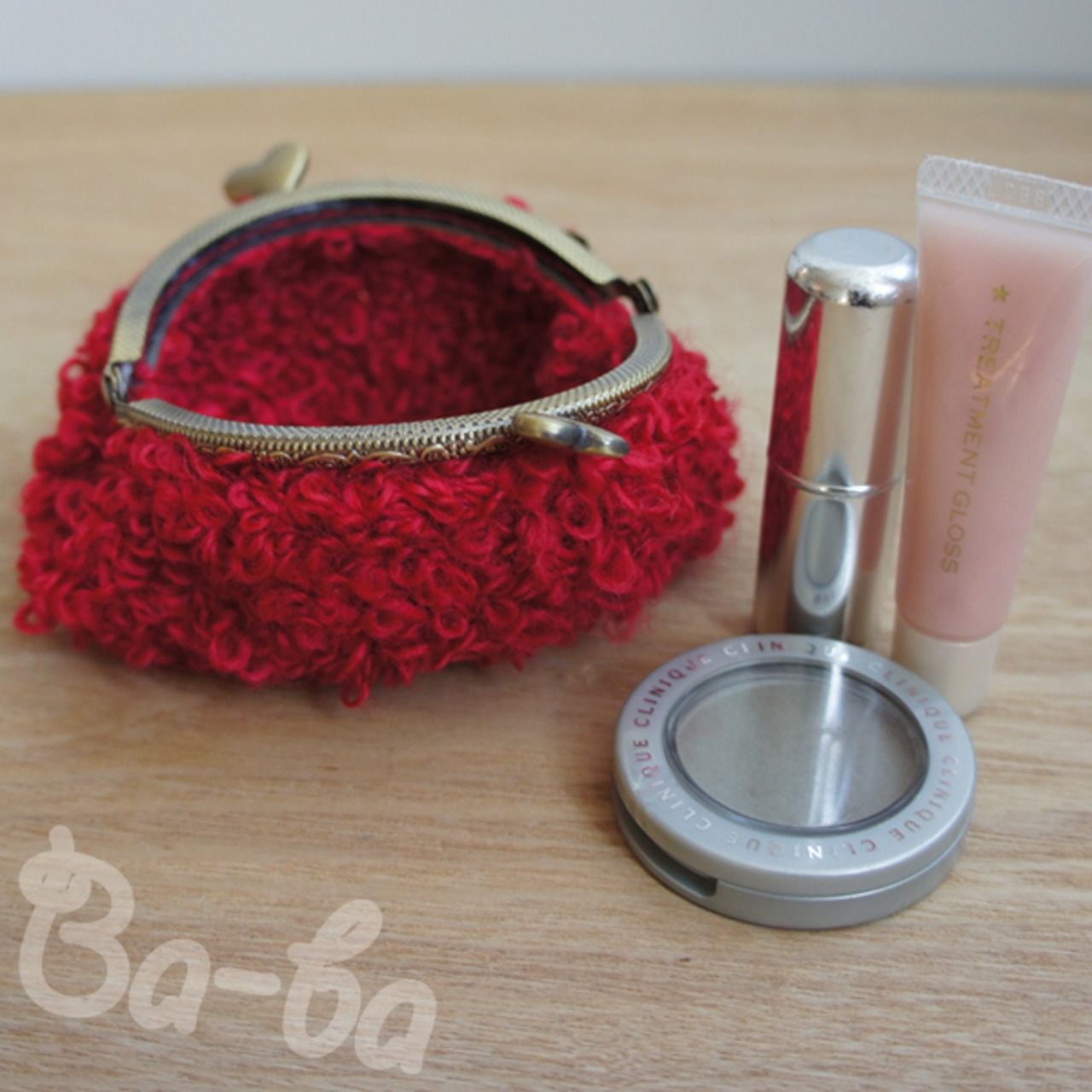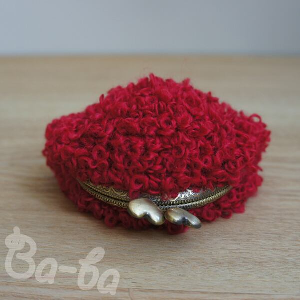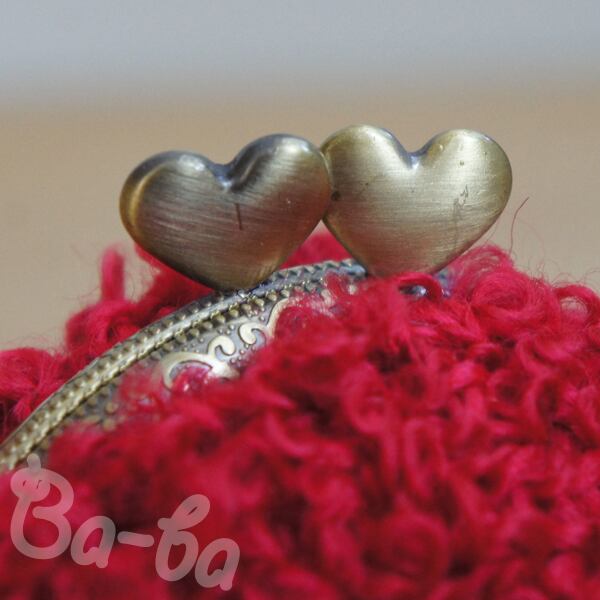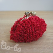 鮮やかな赤のループヤーンをふんわりと編み上げ、ハートの口金と組み合わせました。
