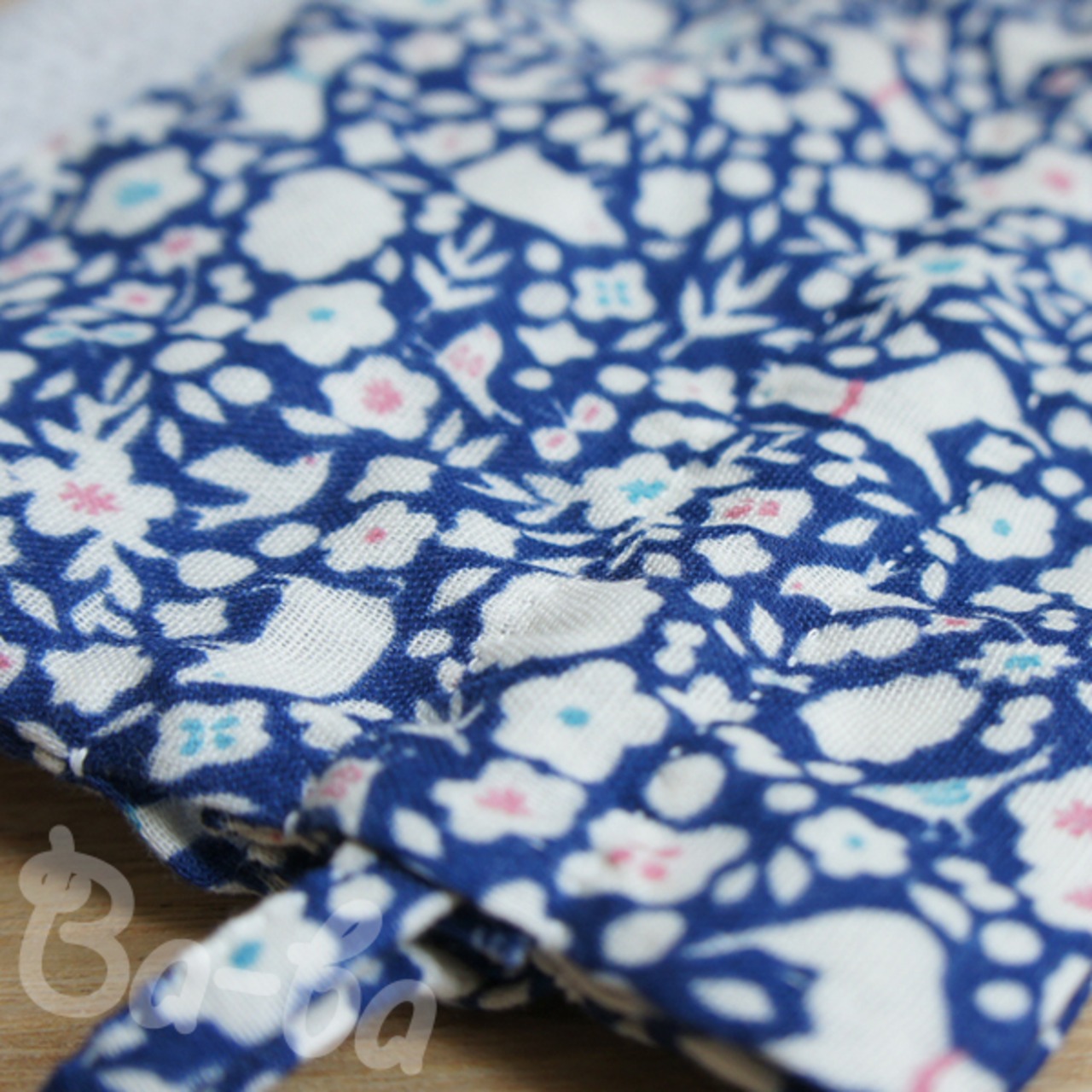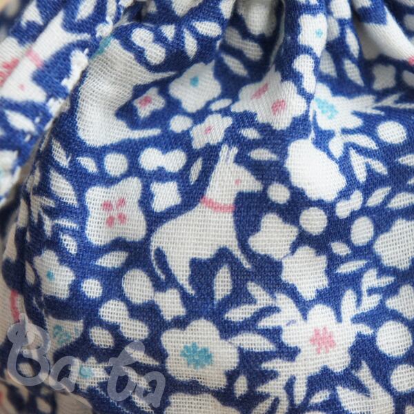 布 : コットンダブルガーゼ(青色地に白い花、動物柄)