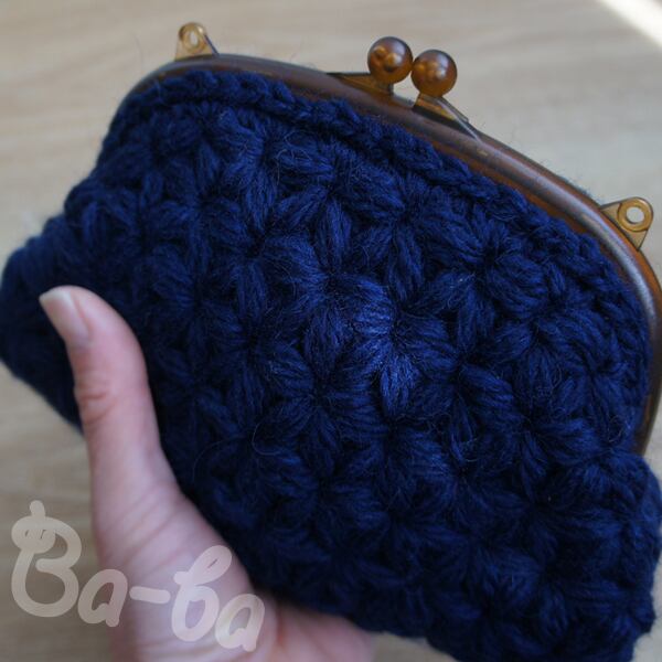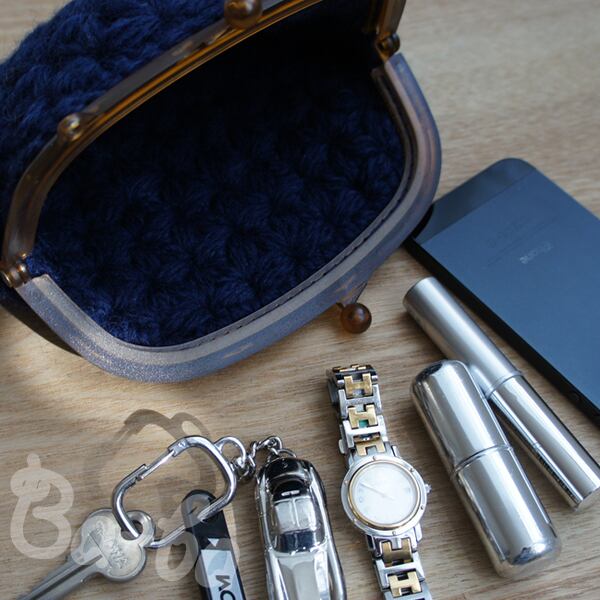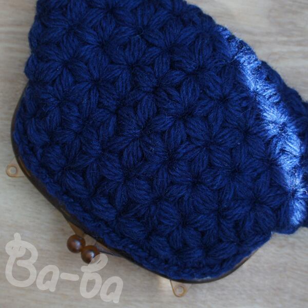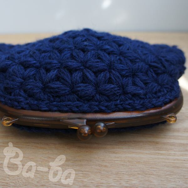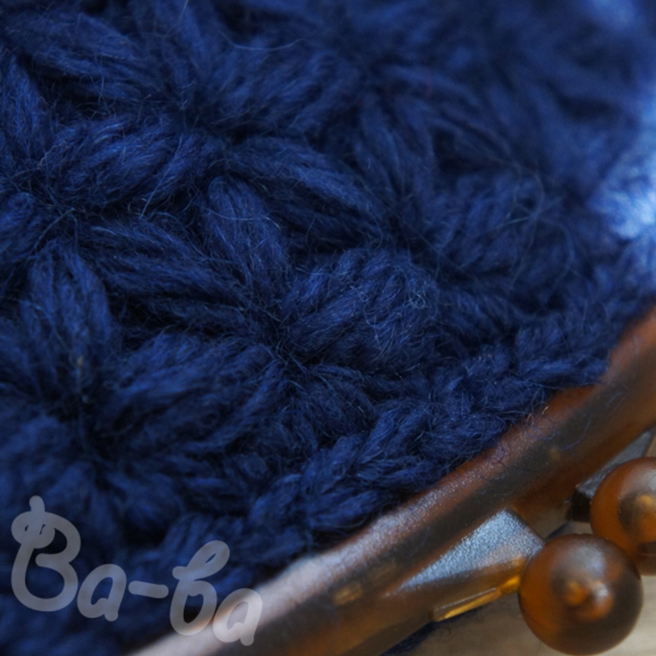 編み地は羊毛混毛糸のリフ編みでボリュームたっぷり+プラ口金で軽量に仕上げました。