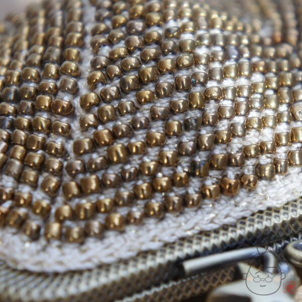 アンティークゴールドのガラスビーズを全面に一粒づつ編み込みました。