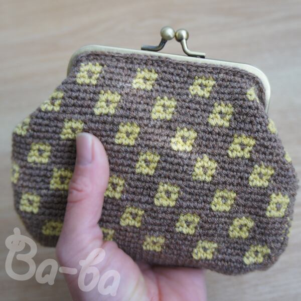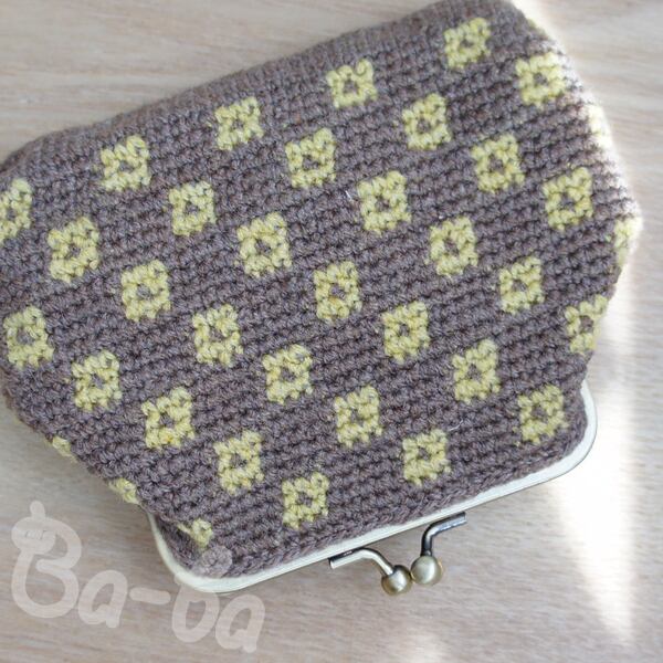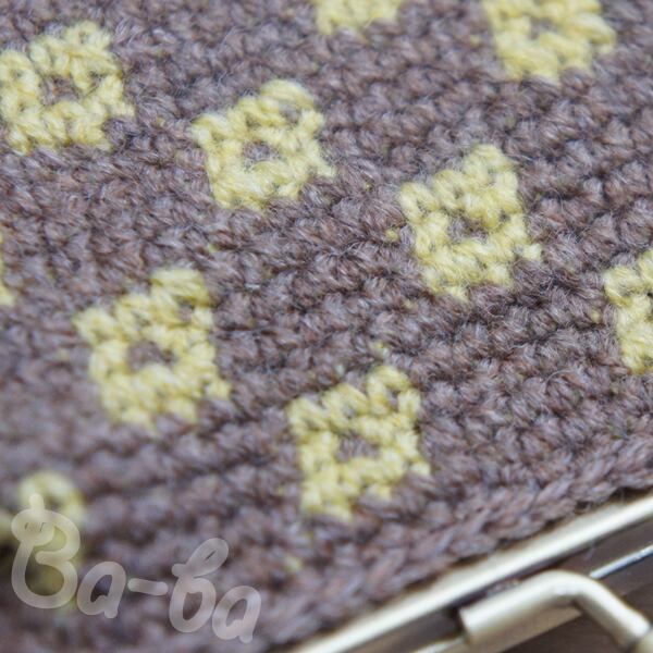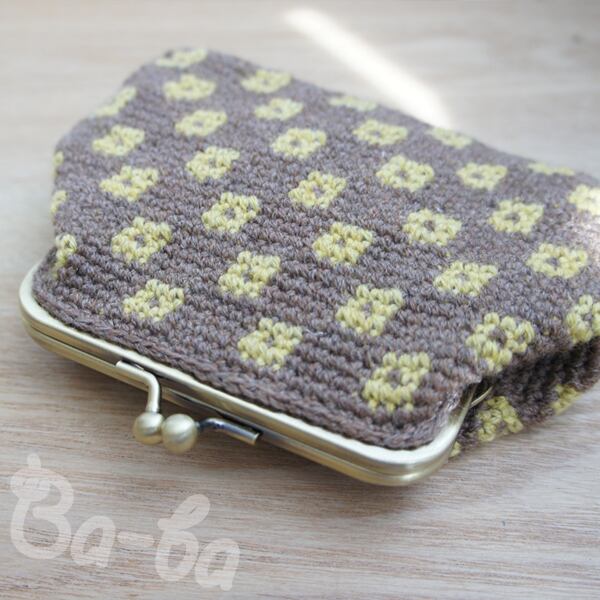 2色の極細毛糸を編み込み模様「銭紋」の大きめがま口に仕上げました。