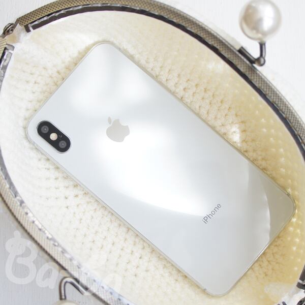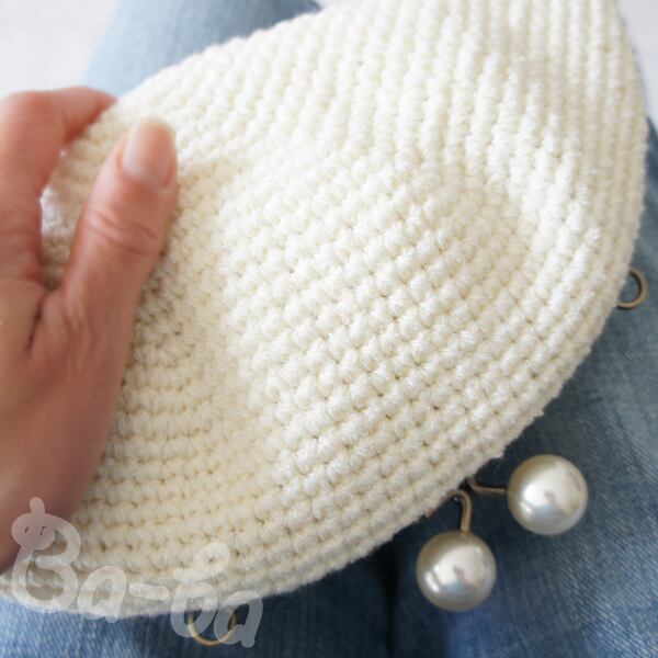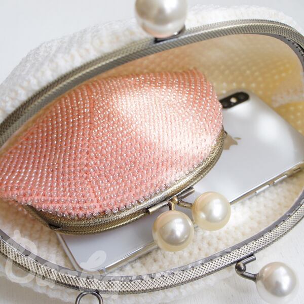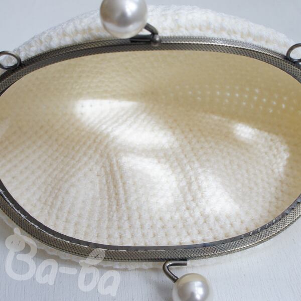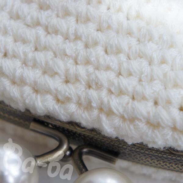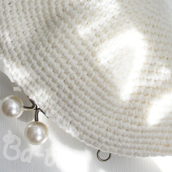 シンプルな編み地に存在感のあるパールつまみの口金を合わせました。