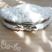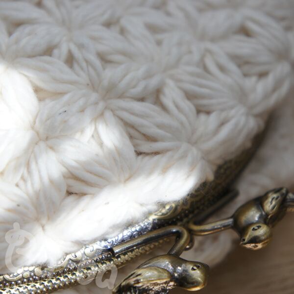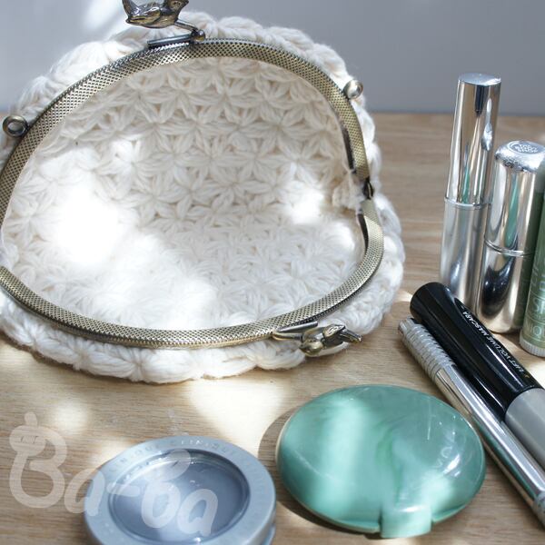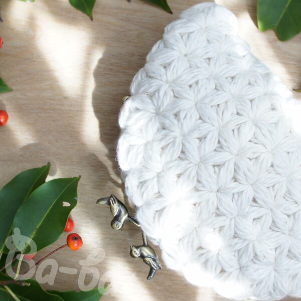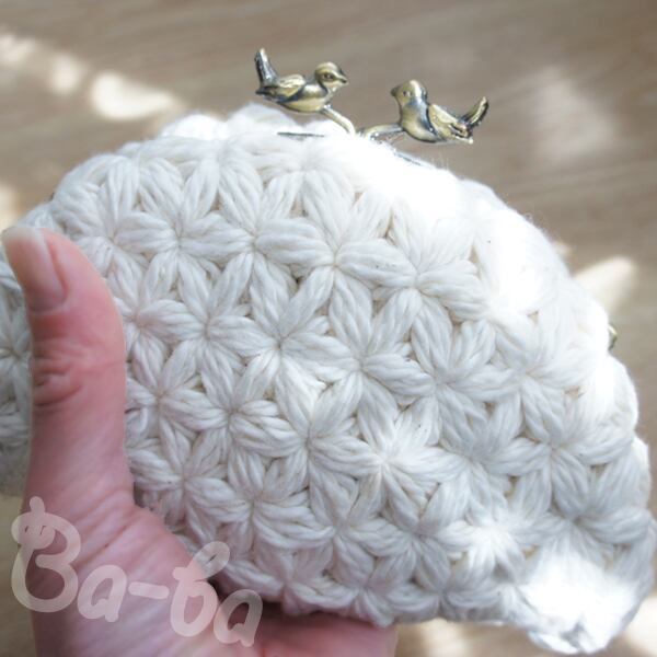 生成りのコットンサマーヤーンをリフ編みで編み上げ、小鳥の口金と組み合わせました。
