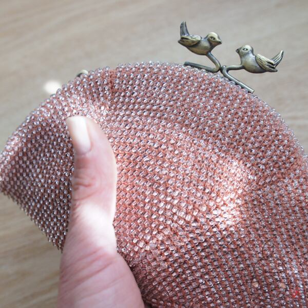 口金は15cmくし形を使用し収納力バツグン、なんでもいろいろ入ります。