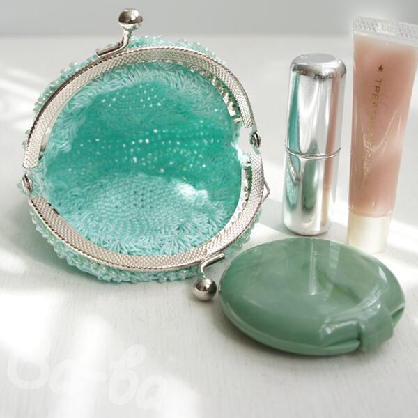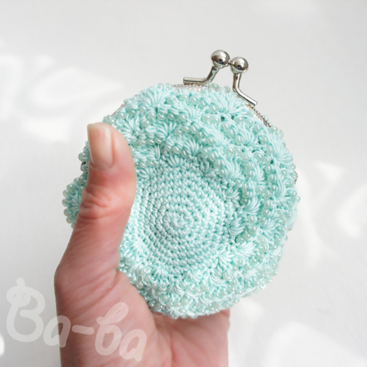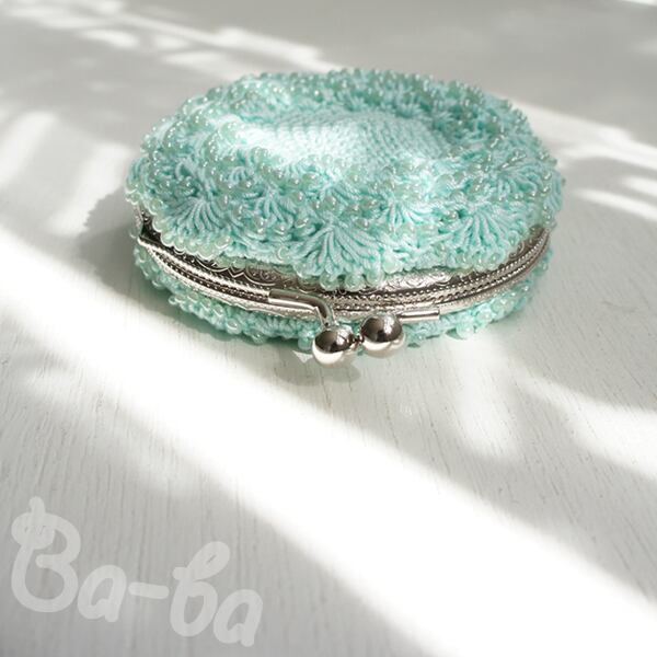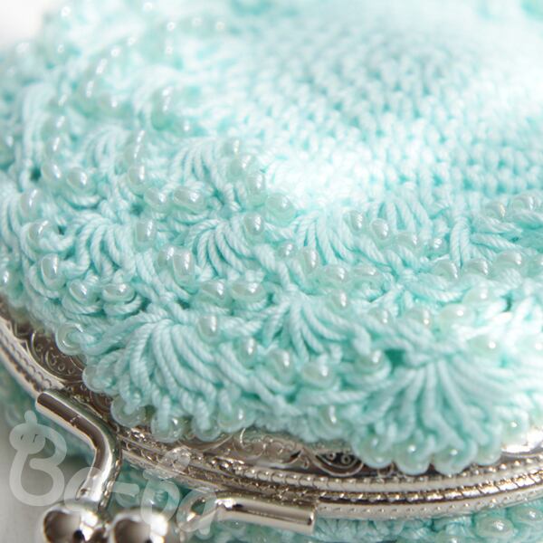 ばあば作、ビーズ入り松編み・まるまるがま口(mintgreen・C1324)