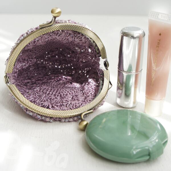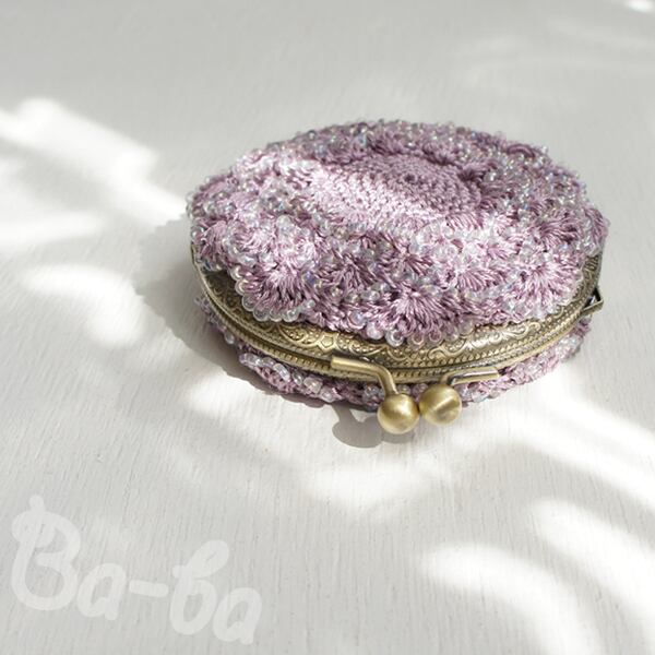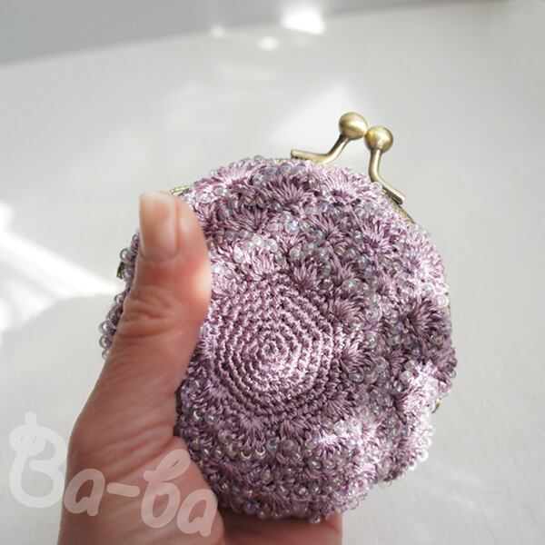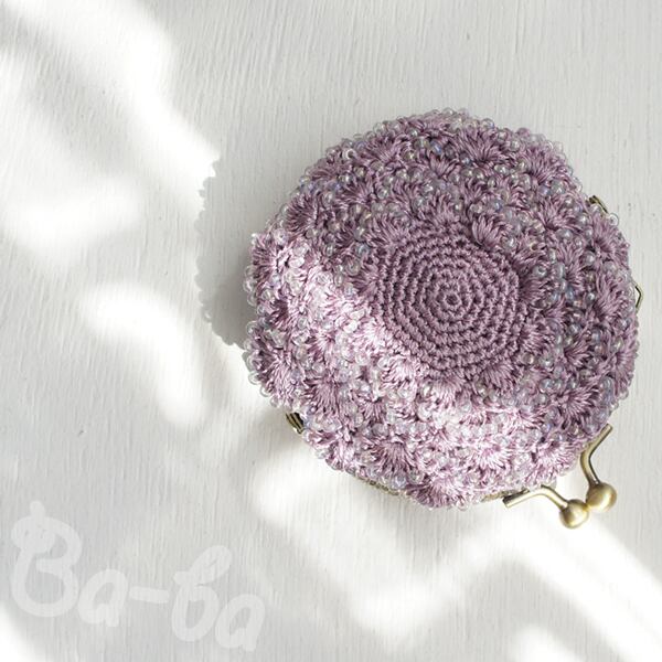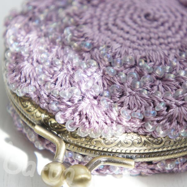 ばあば作、ビーズ入り松編み・まるまるがま口(lilac・C1322)