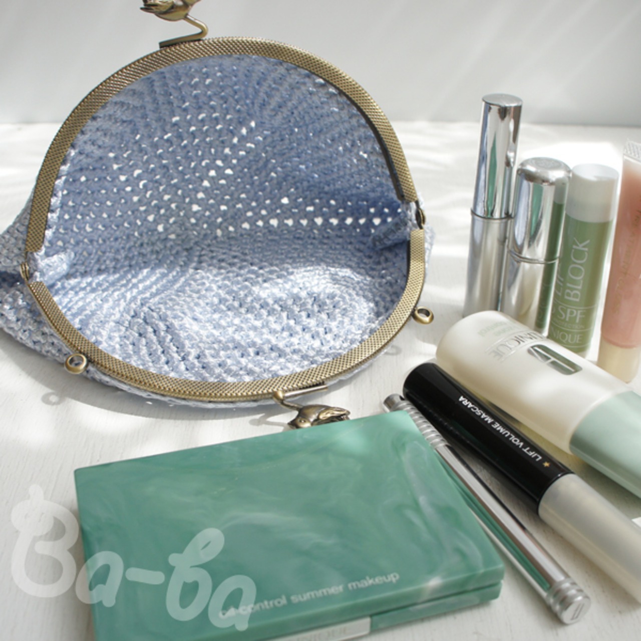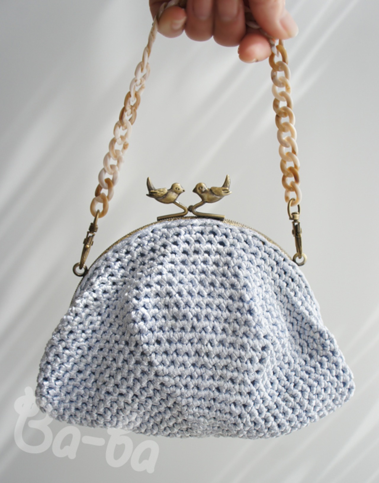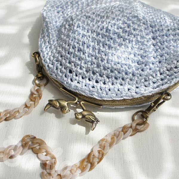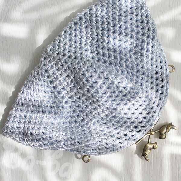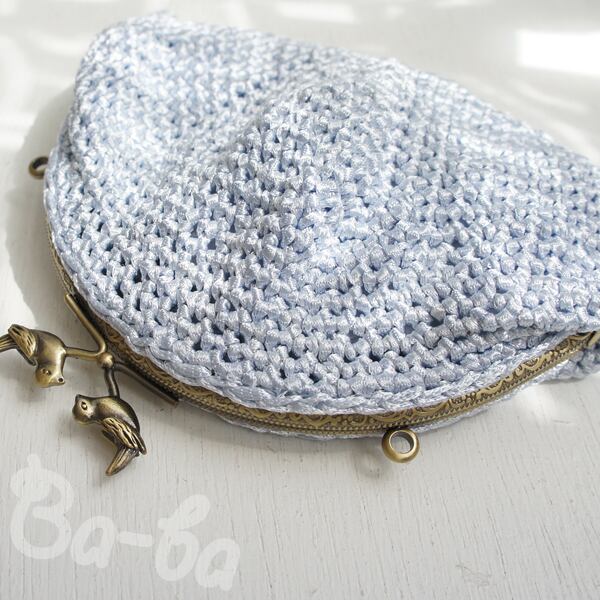 フランス製ツヤツヤ水色の糸をシンプルに細編みで編み上げ、