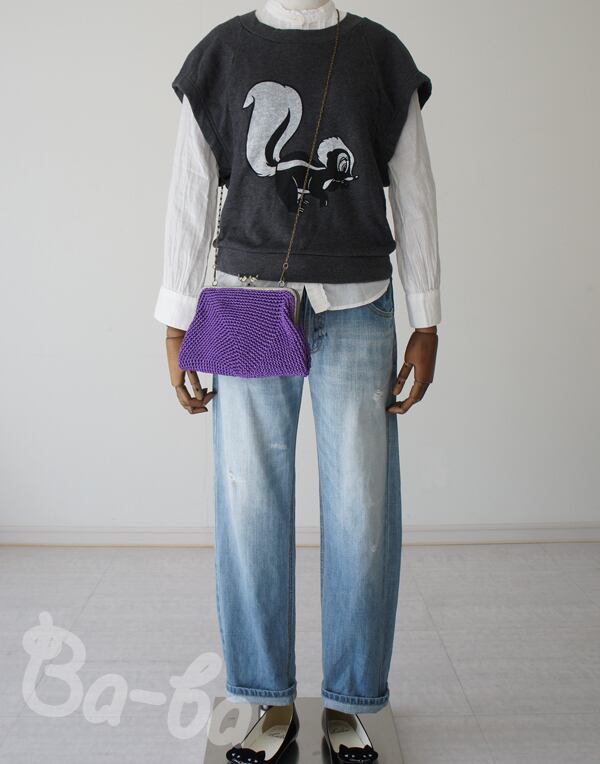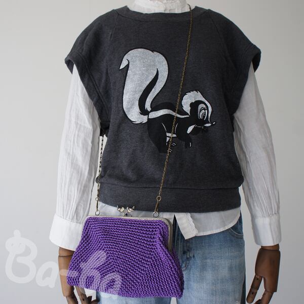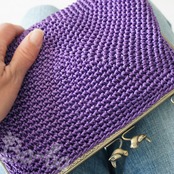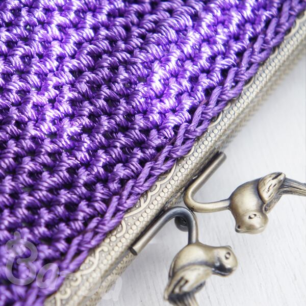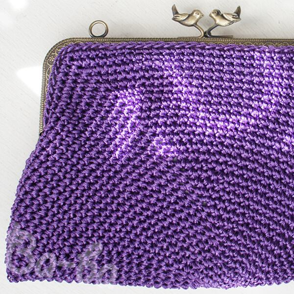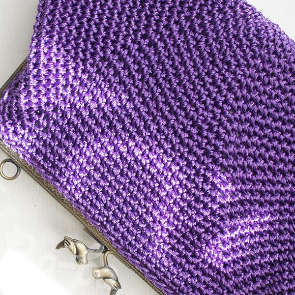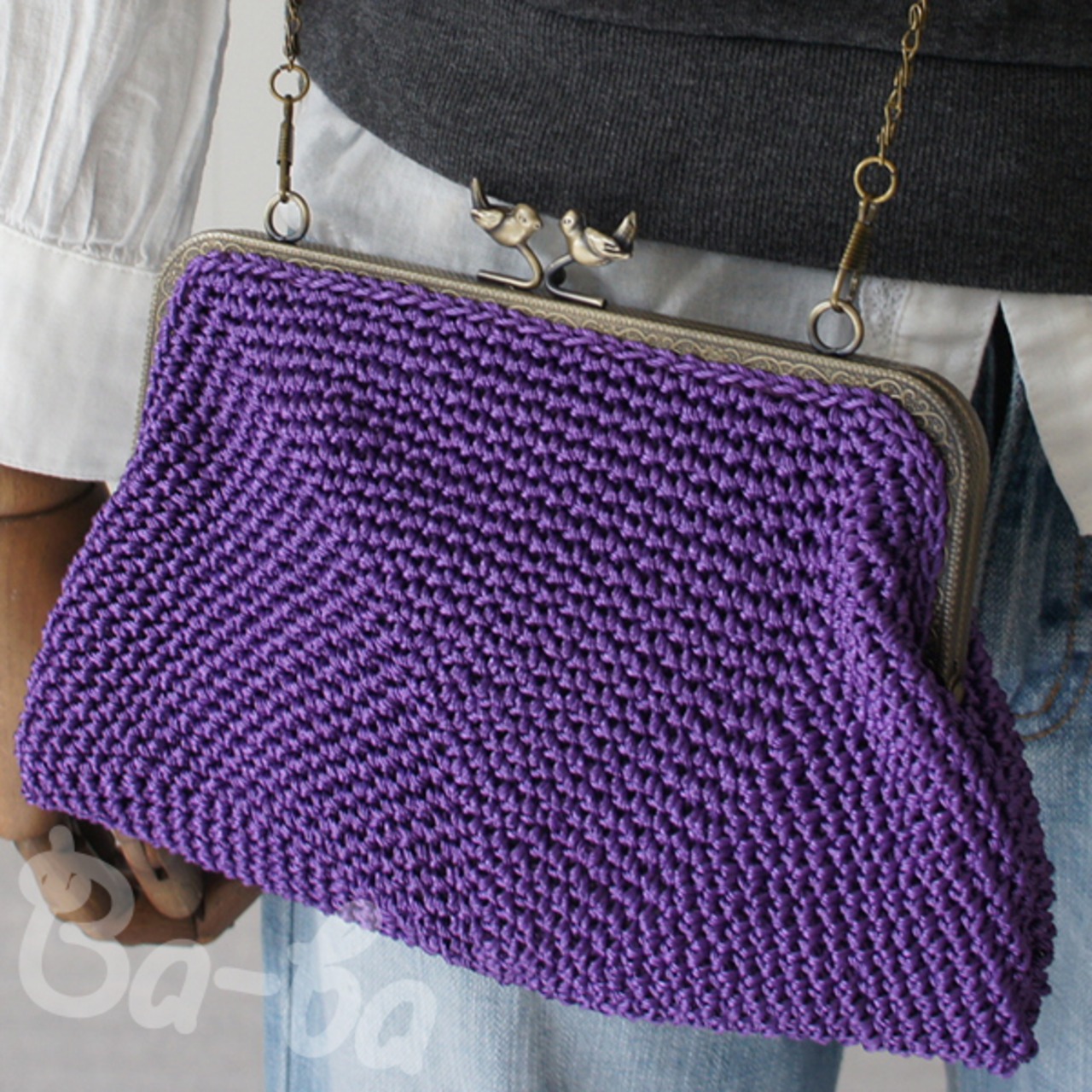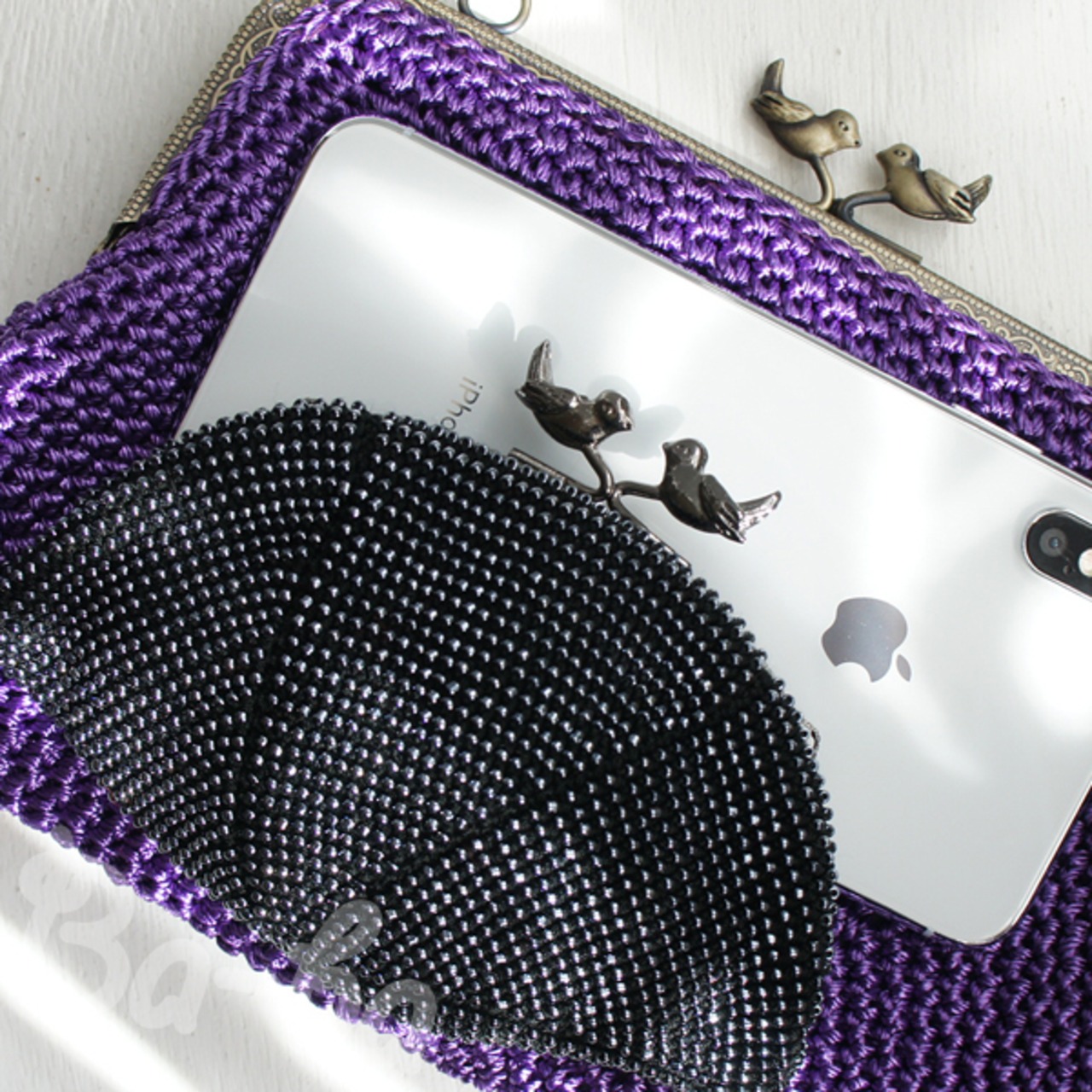 シンプルな編み地に存在感のある小鳥つまみのスクエア口金を組み合わせました。