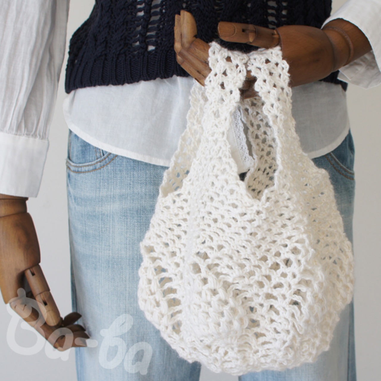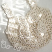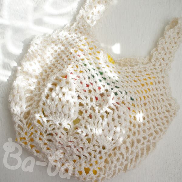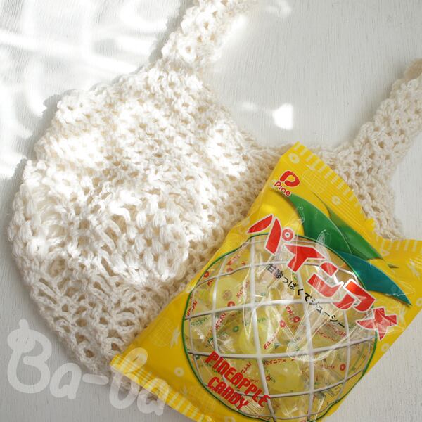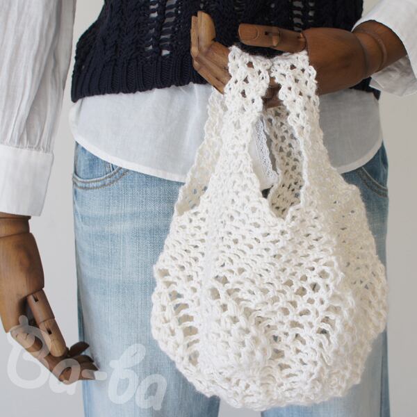 ふんわりとしたサマーヤーンのパイナップル模様を編み込んだ小さな手さげ袋。