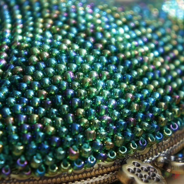 多色に輝く3mmのビーズを、ひとつぶづつ全面に編み込みました。