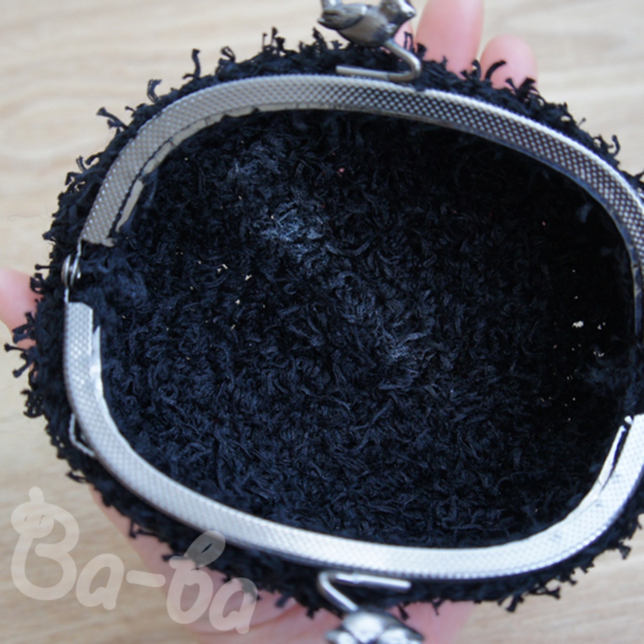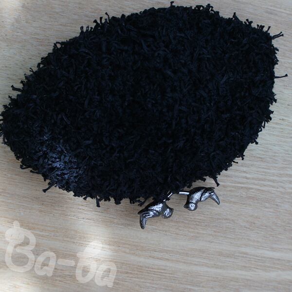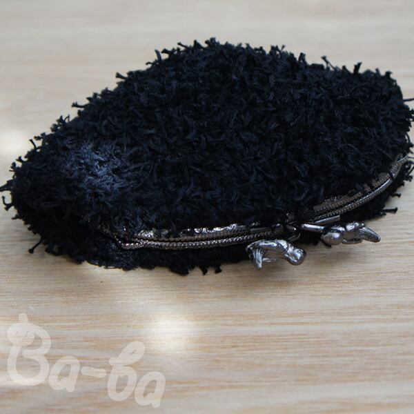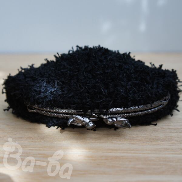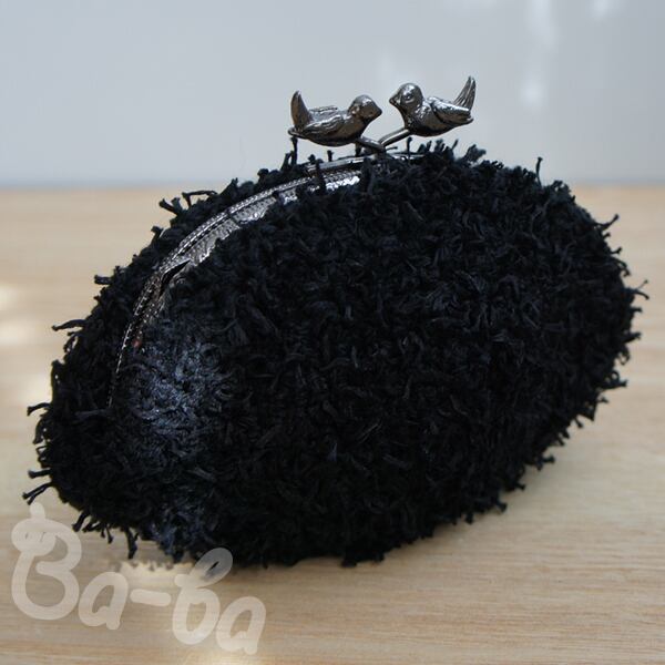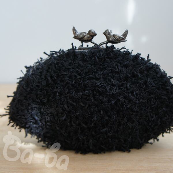 黒色のふわふわフェザーヤーンをふんわりと編み上げ、小鳥の口金と組み合わせました。