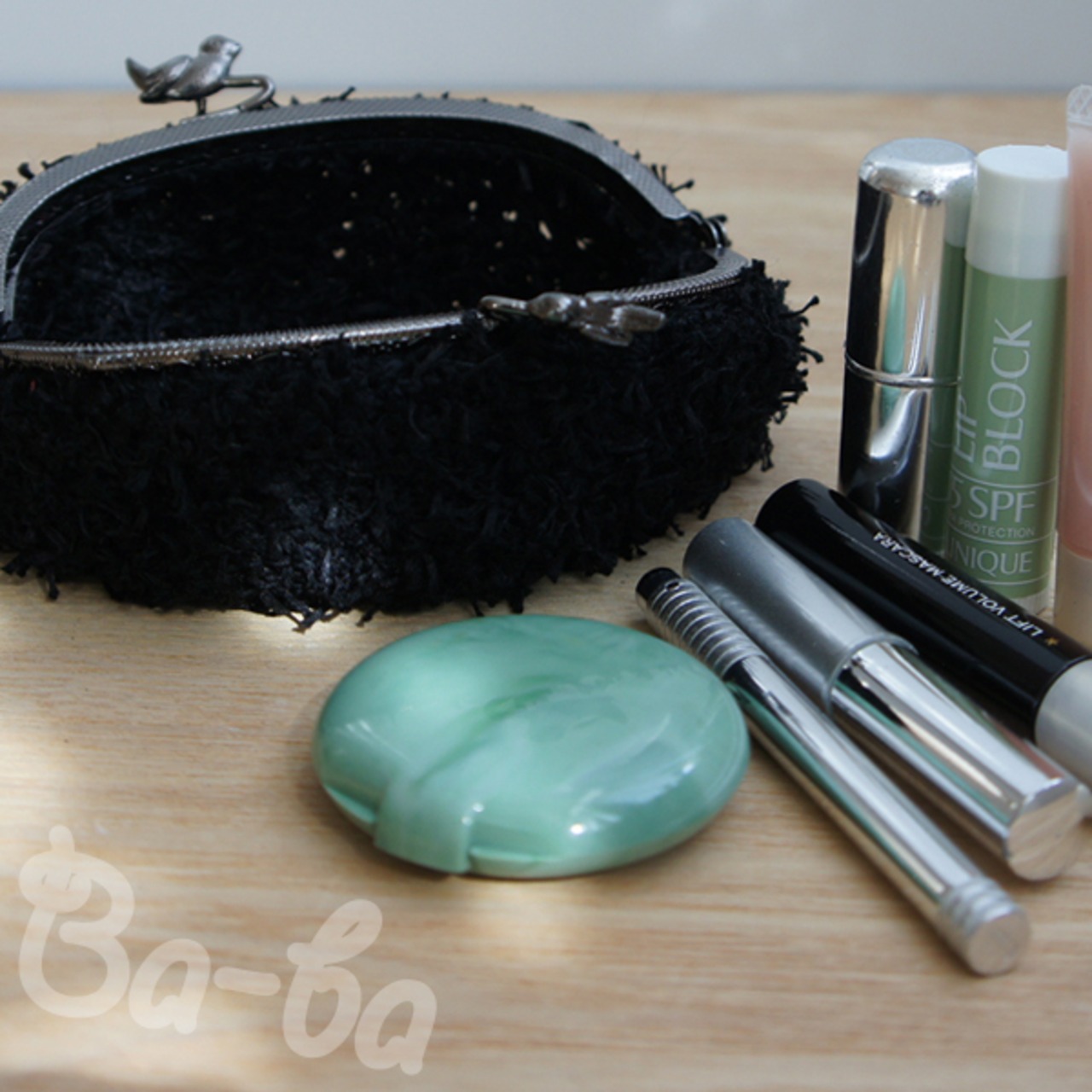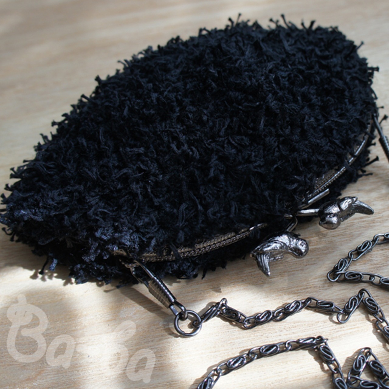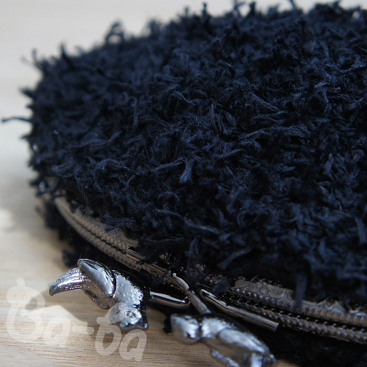 黒色のふわふわフェザーヤーンをふんわりと編み上げ、小鳥の口金と組み合わせました。