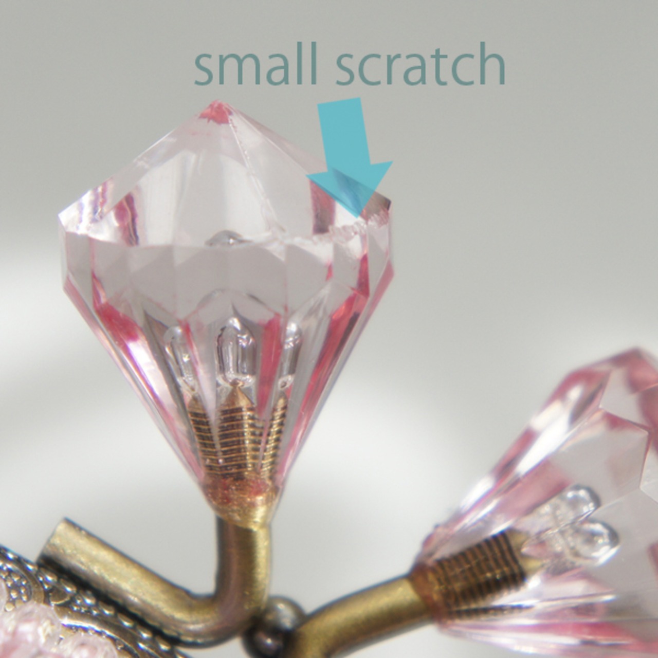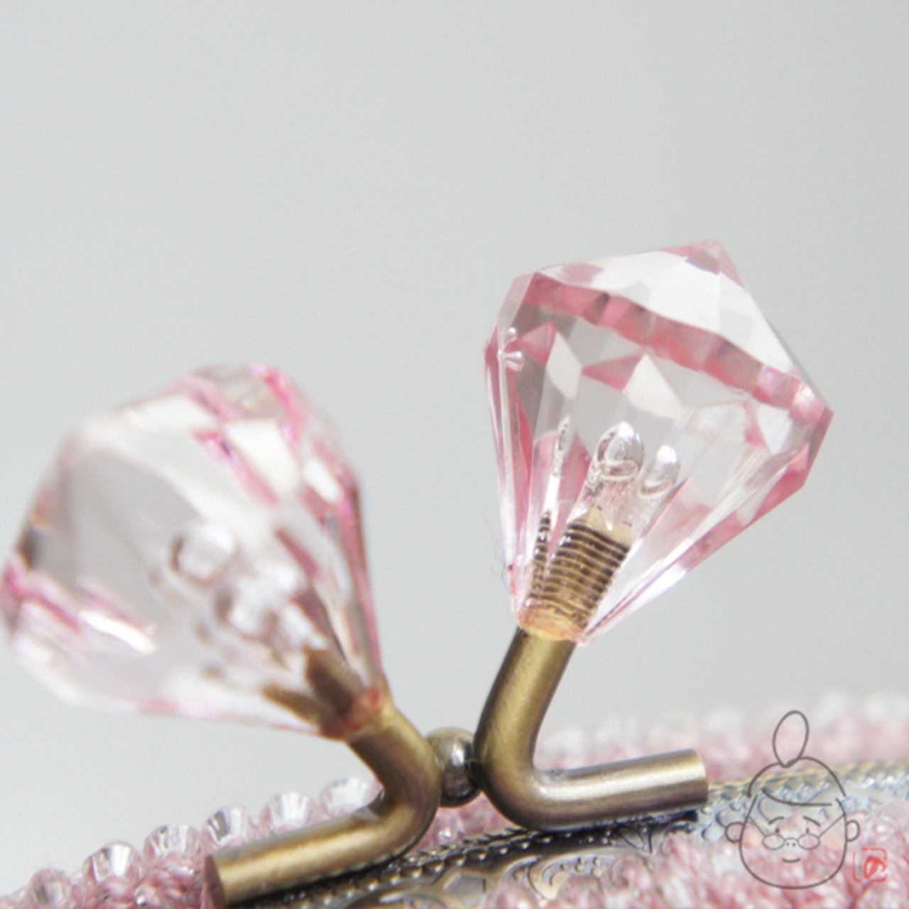 口金 : アンティークゴールド、クリアピンクダイヤつまみ、15cm、くし型、両カン