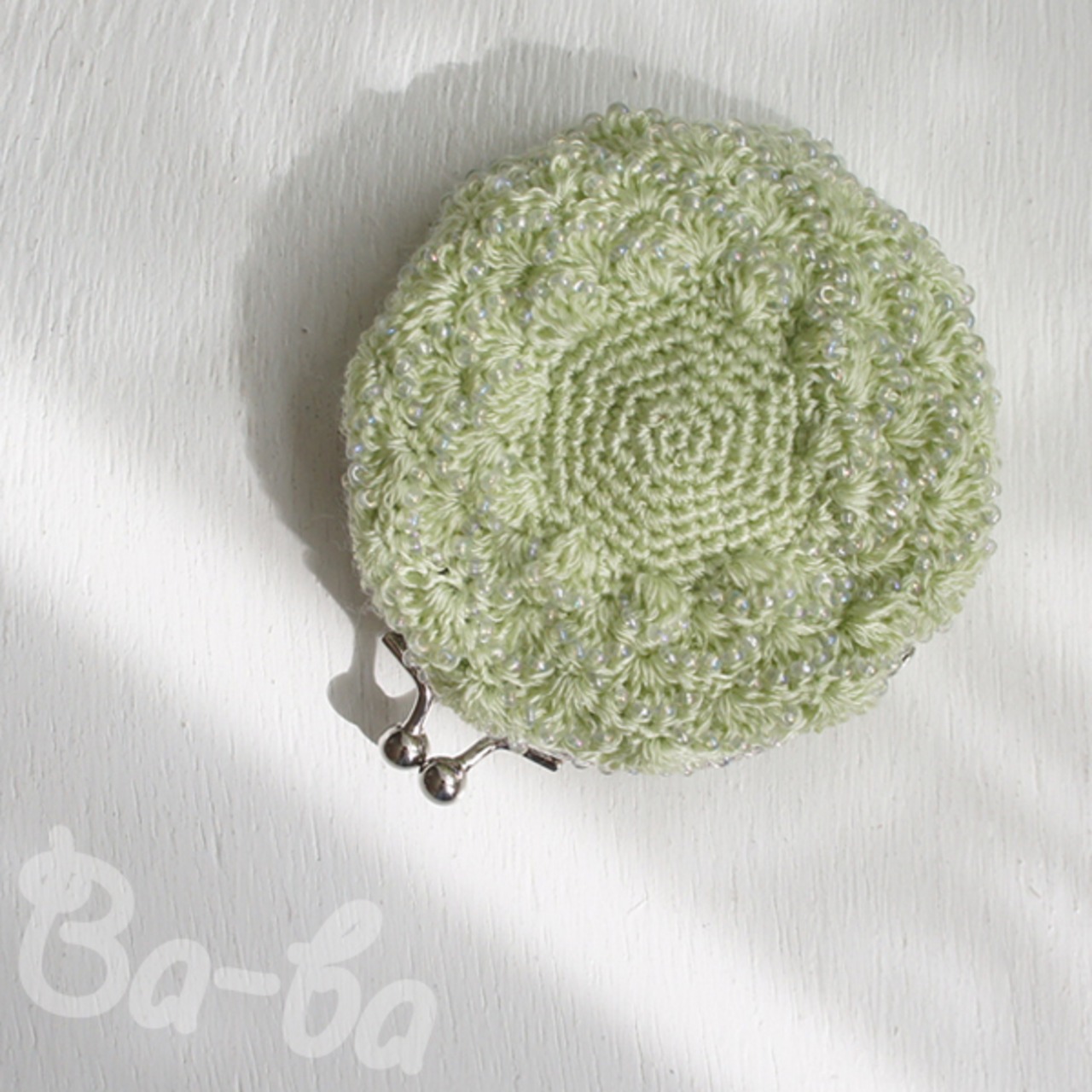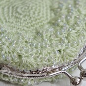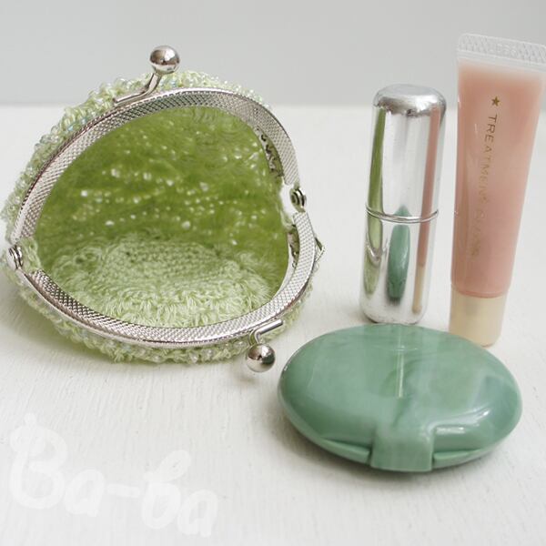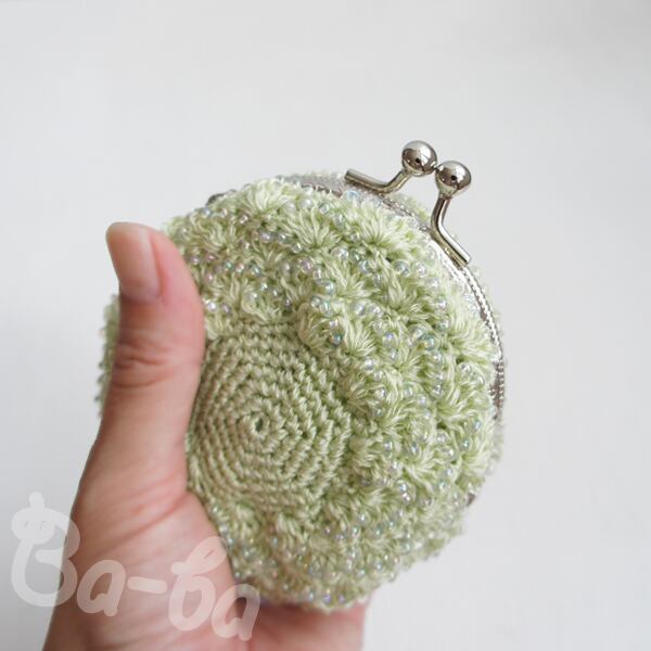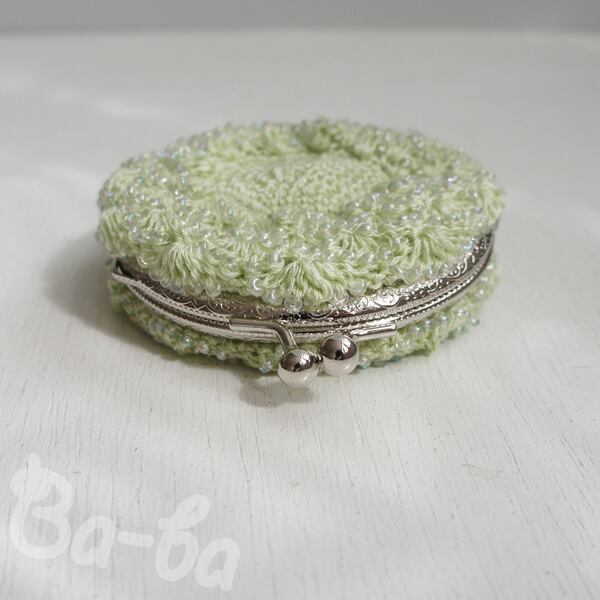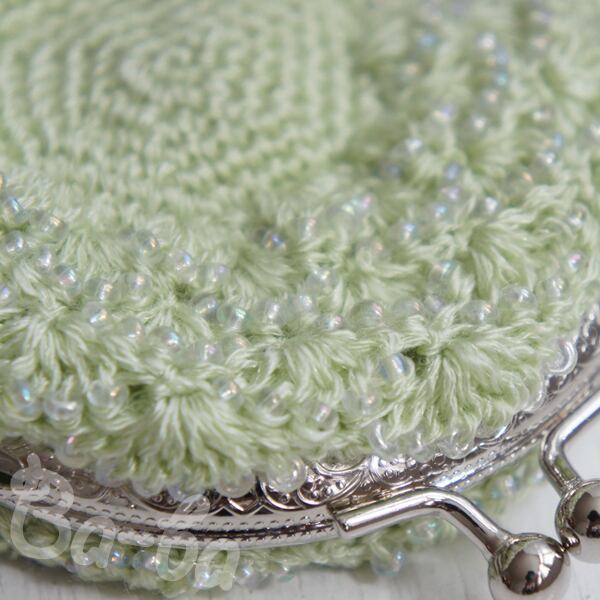 ばあば作、ビーズ入り松編み・まるまるがま口(うすもえぎ・C1355)