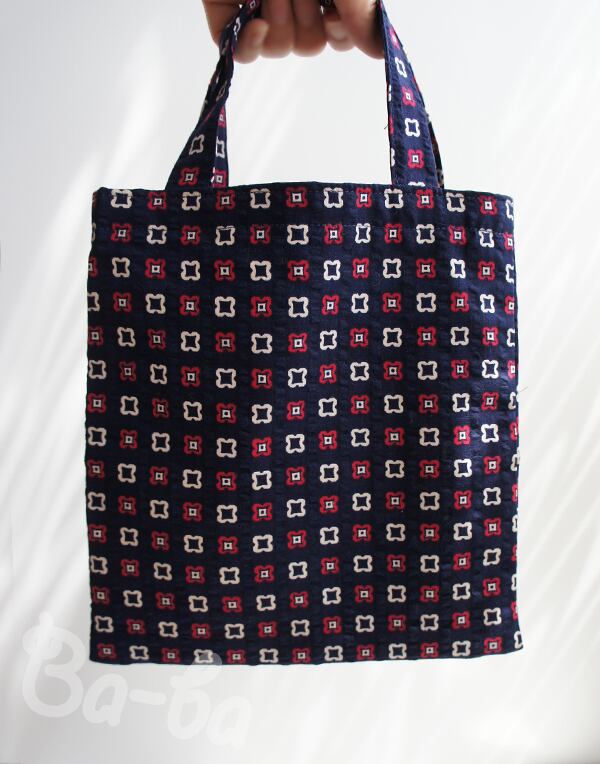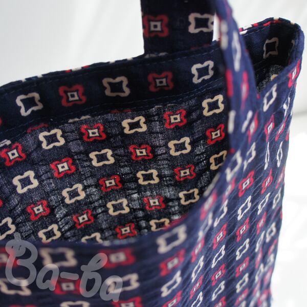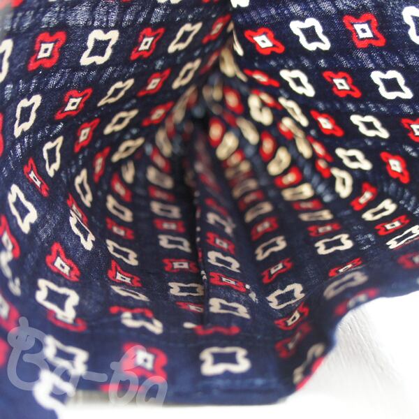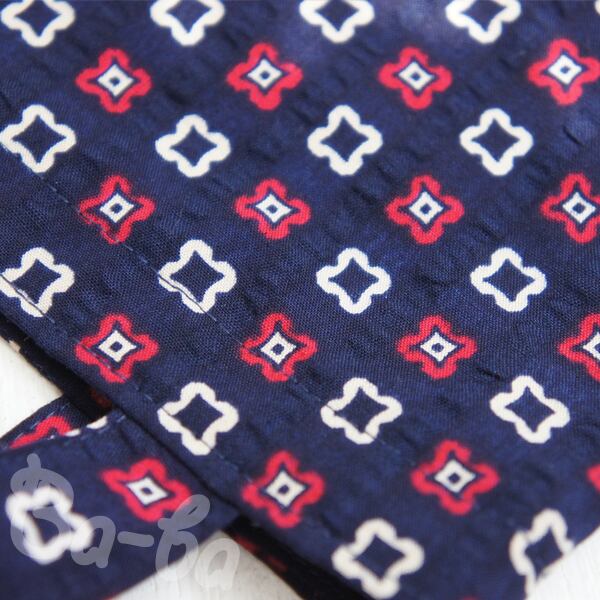 素材 : コットンサッカー生地(紺地に白、赤の四角柄)