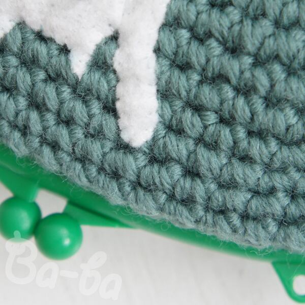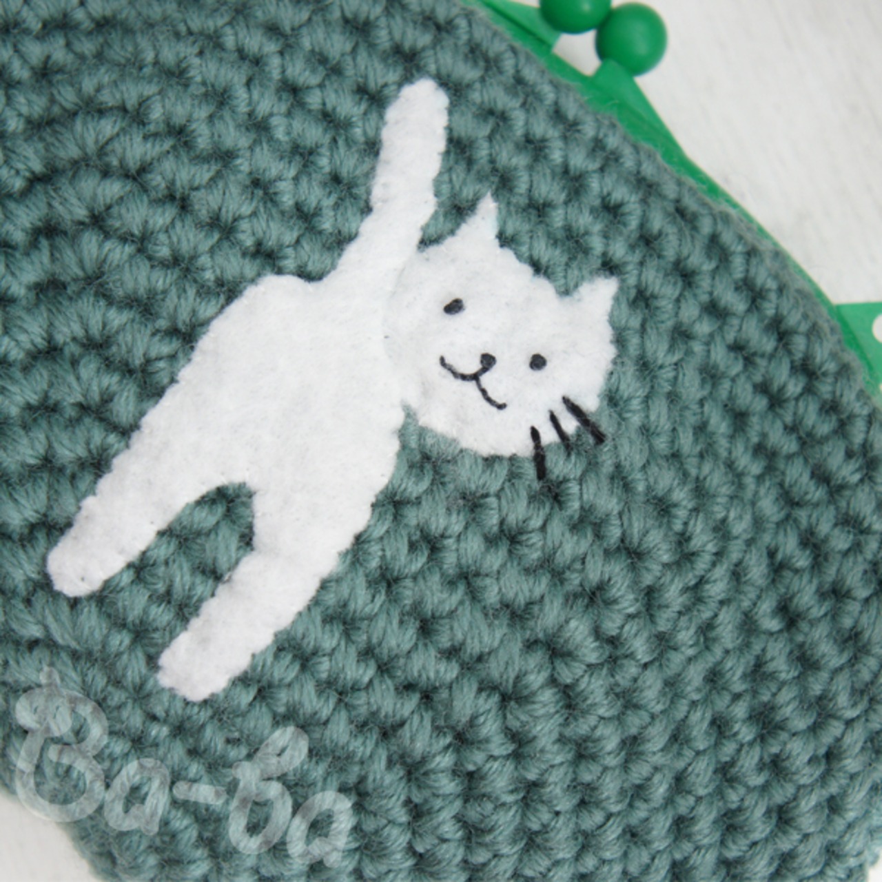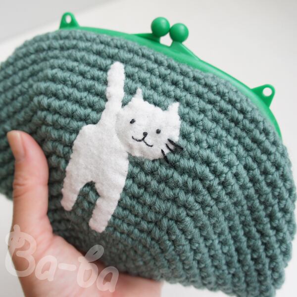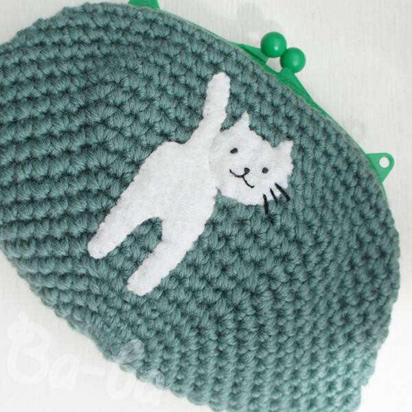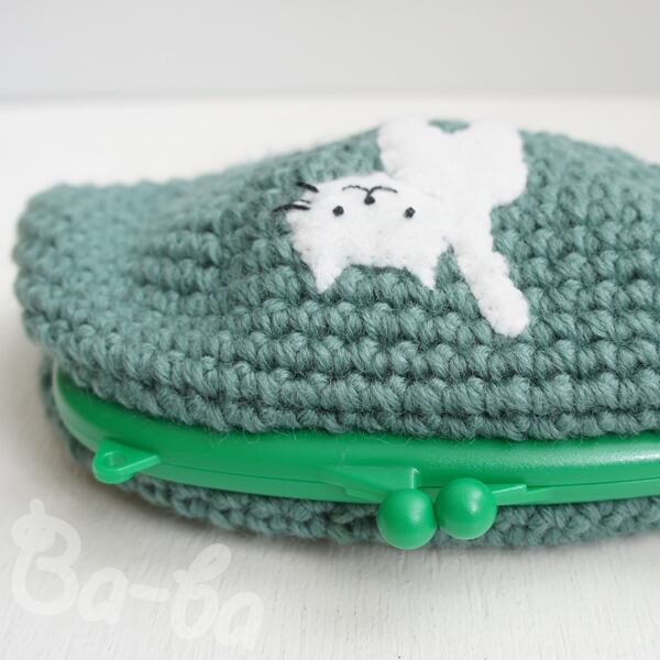 草原のようなグリーン編み地のがま口に、シロのアップリケをしました。