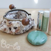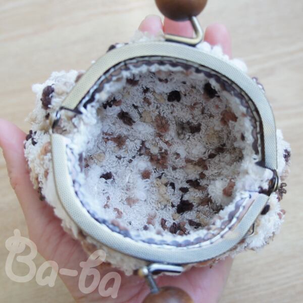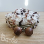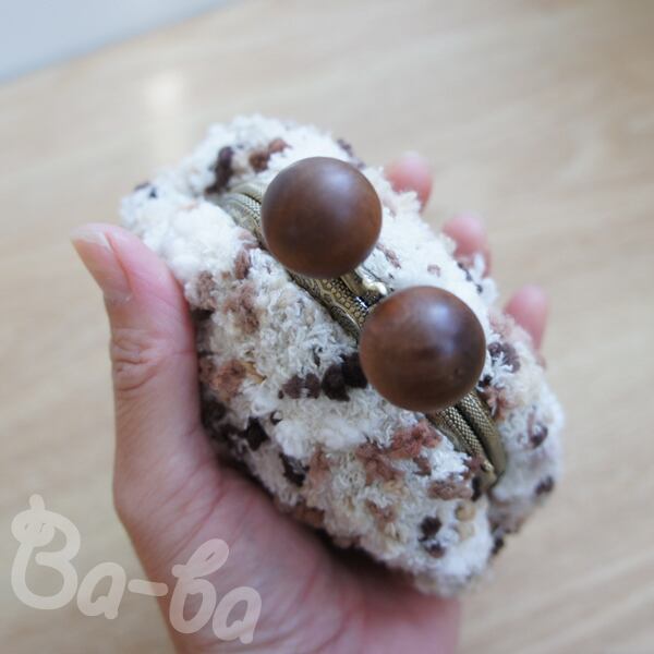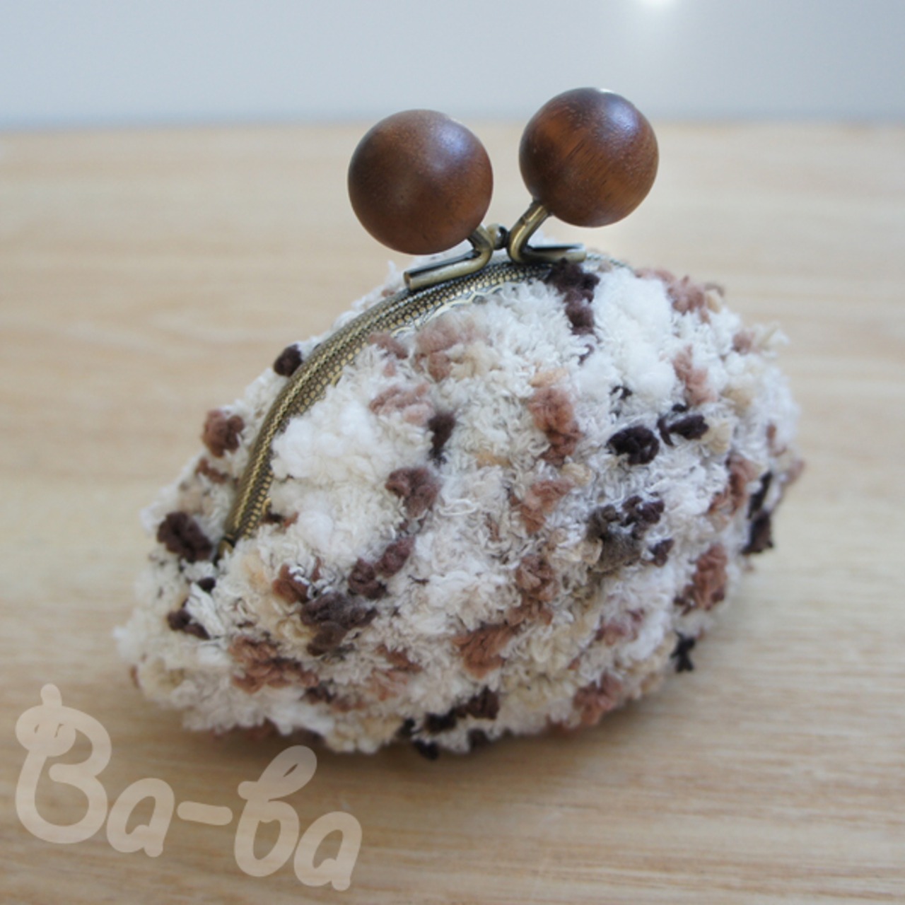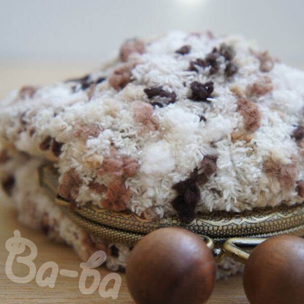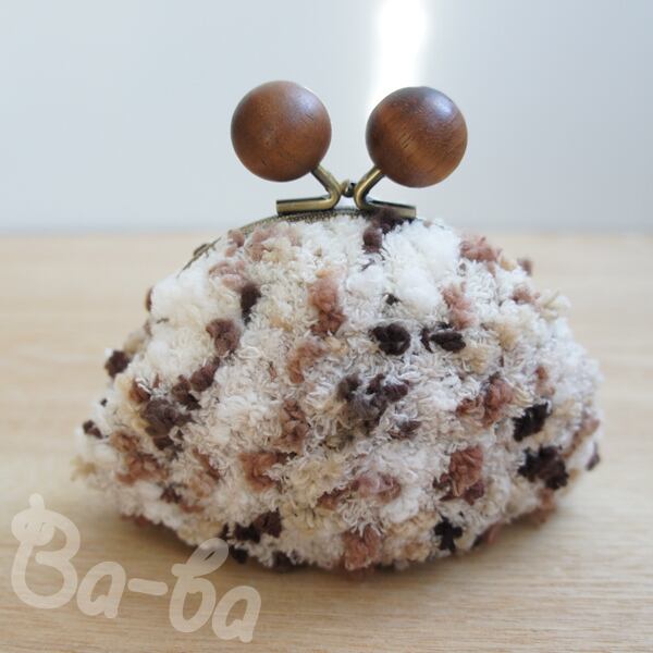 ほんわかブラウン系のモールヤーンをふんわりと編み上げ、ウッドつまみの口金と組み合わせました。