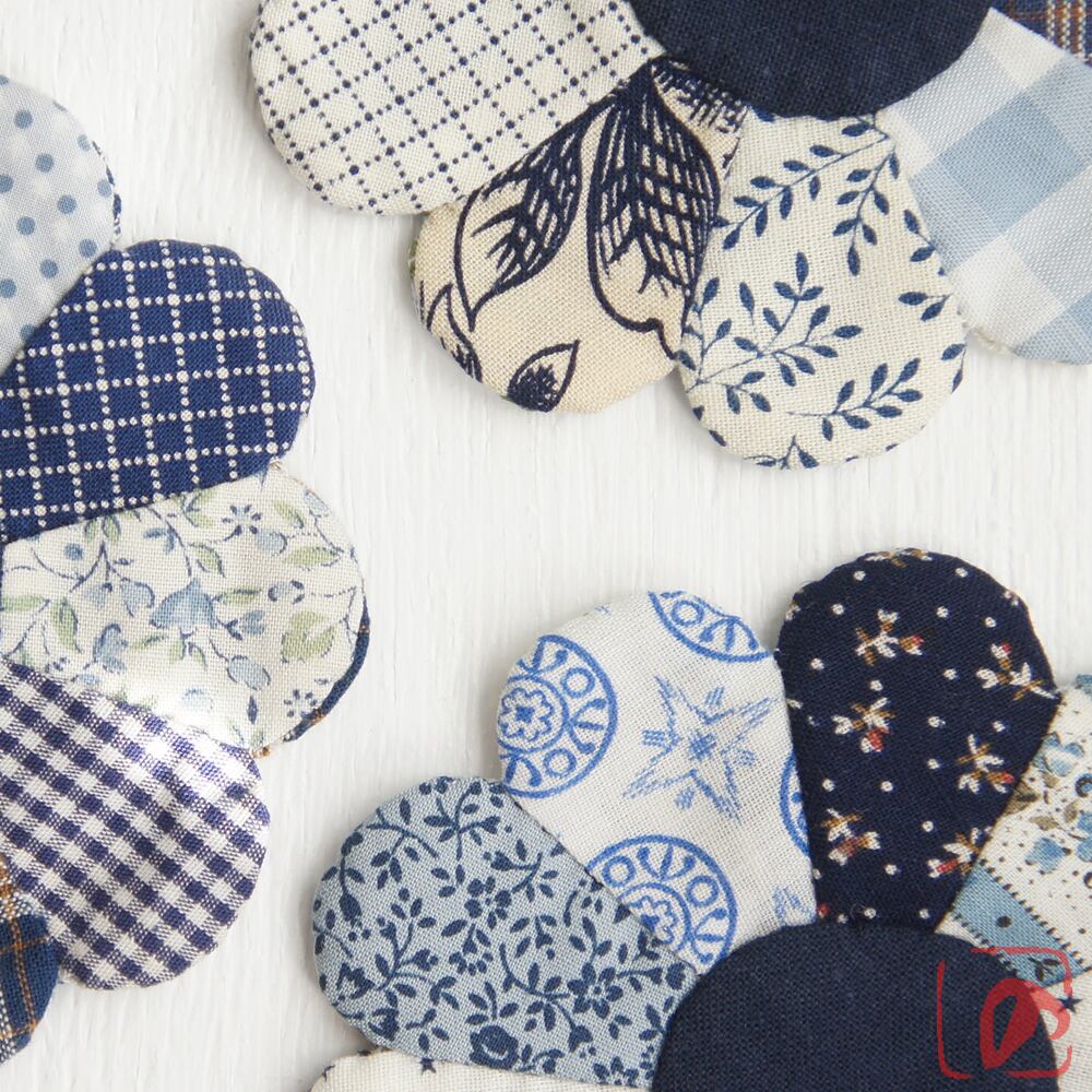 お花やチェックなどブルー系の生地で、一針一針丁寧に手縫いで制作した