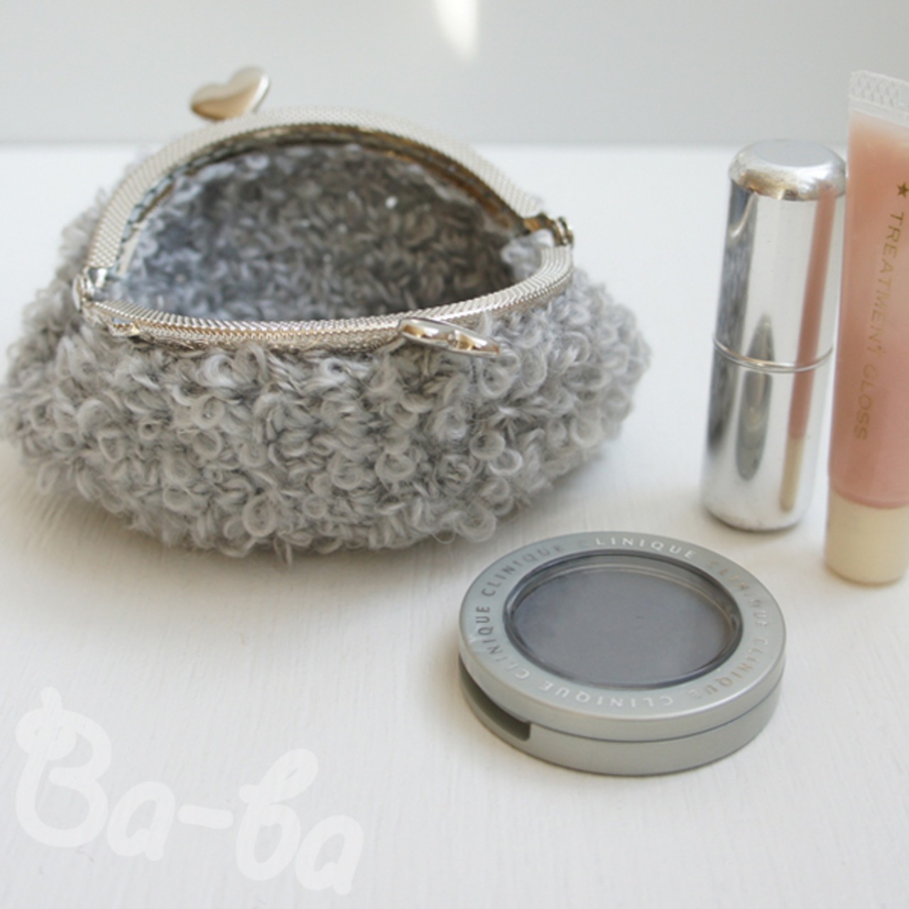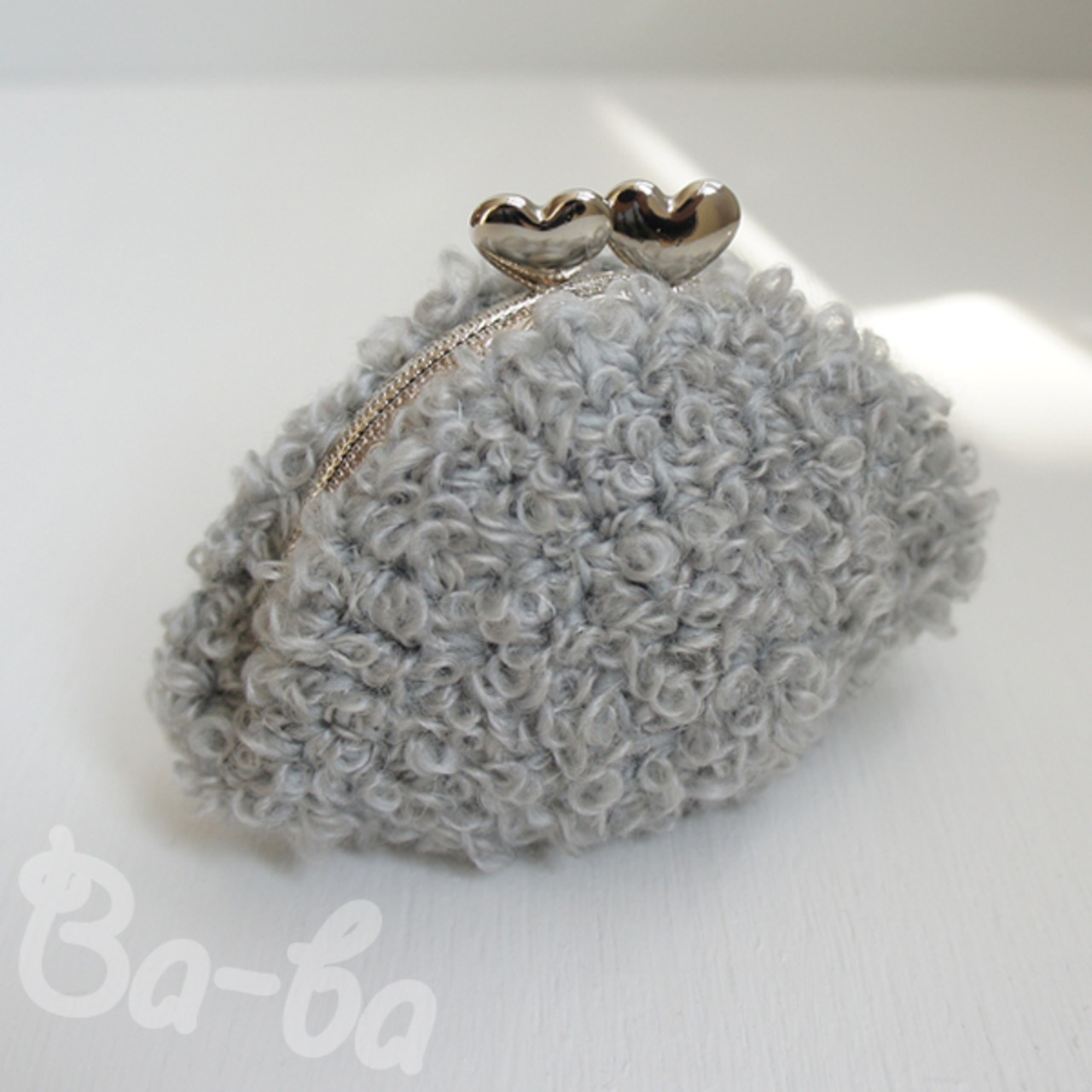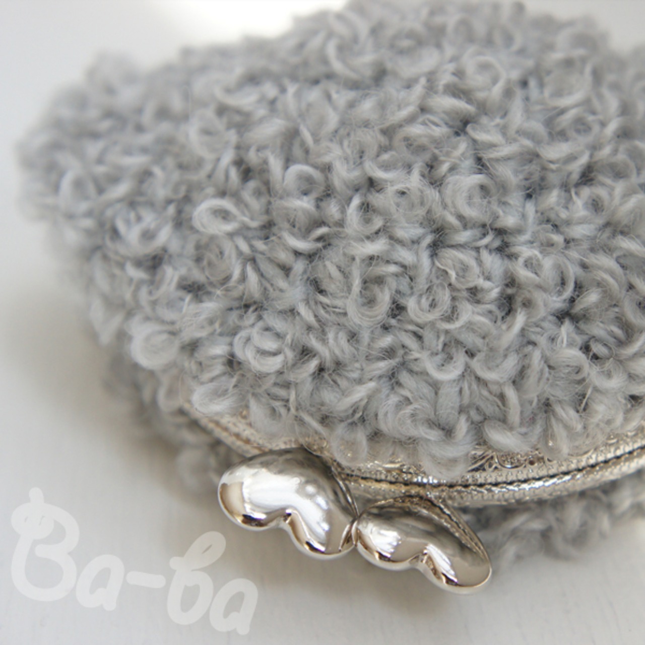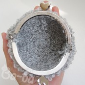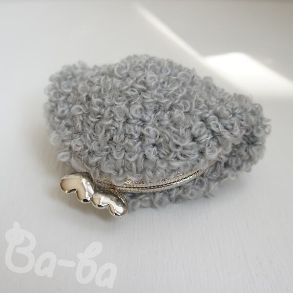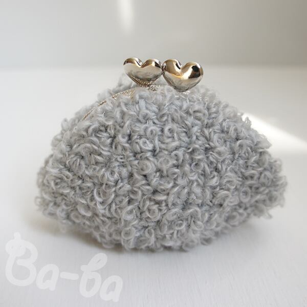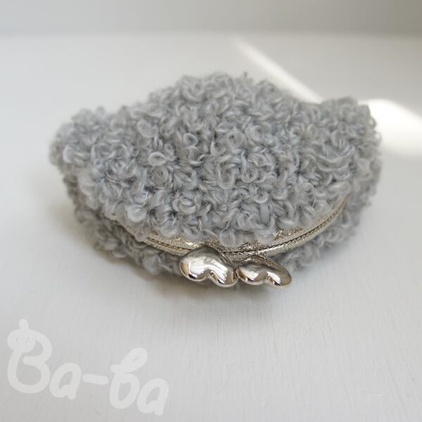 淡いグレーのループヤーンをふんわりと編み上げ、ハートつまみの口金と組み合わせました。
