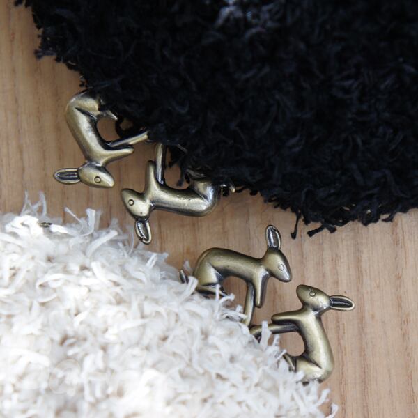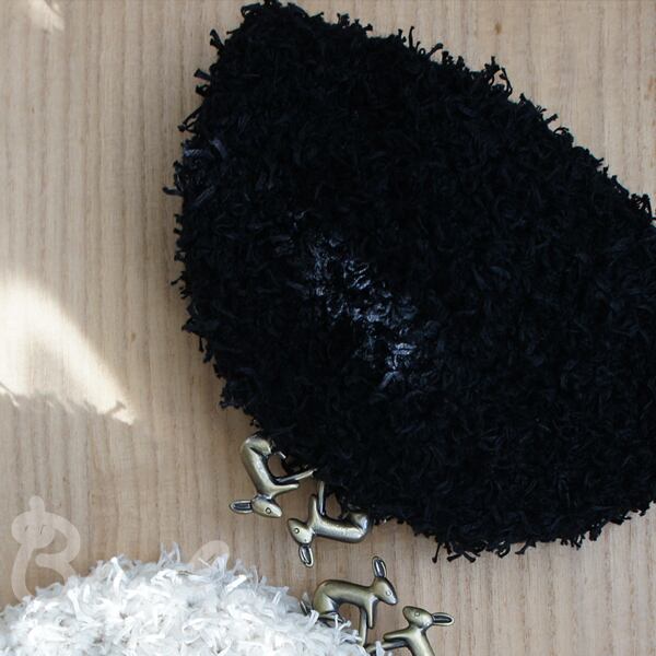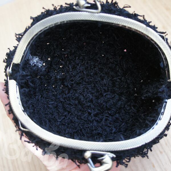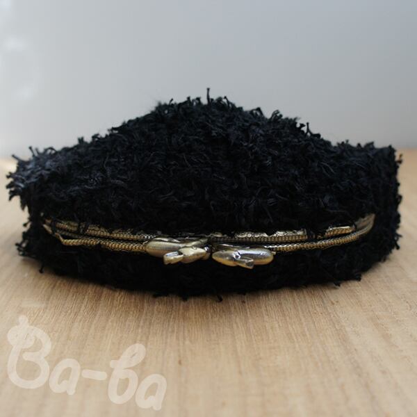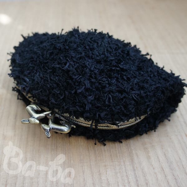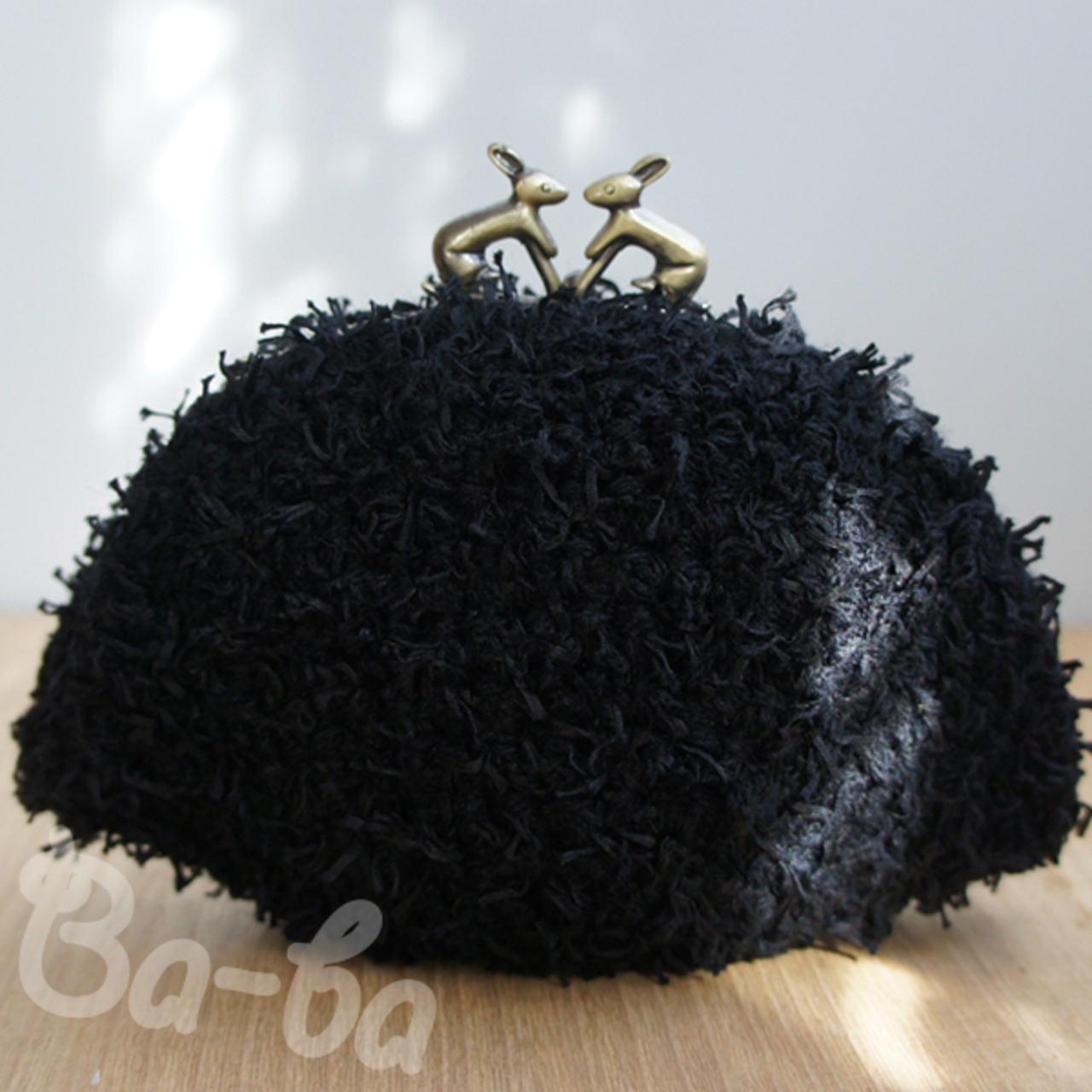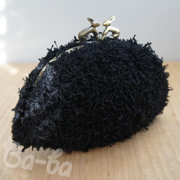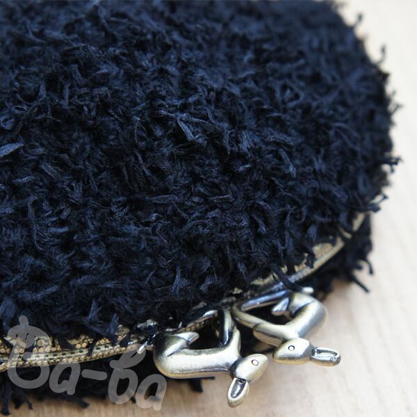 黒いふわふわのフェザーヤーン毛糸をふんわりと編み上げ、うさぎちゃんの口金と組み合わせました。
