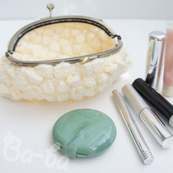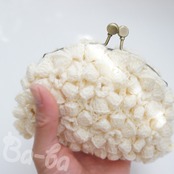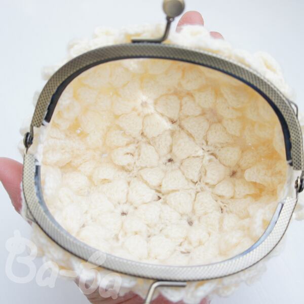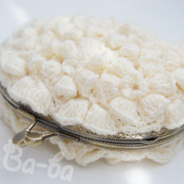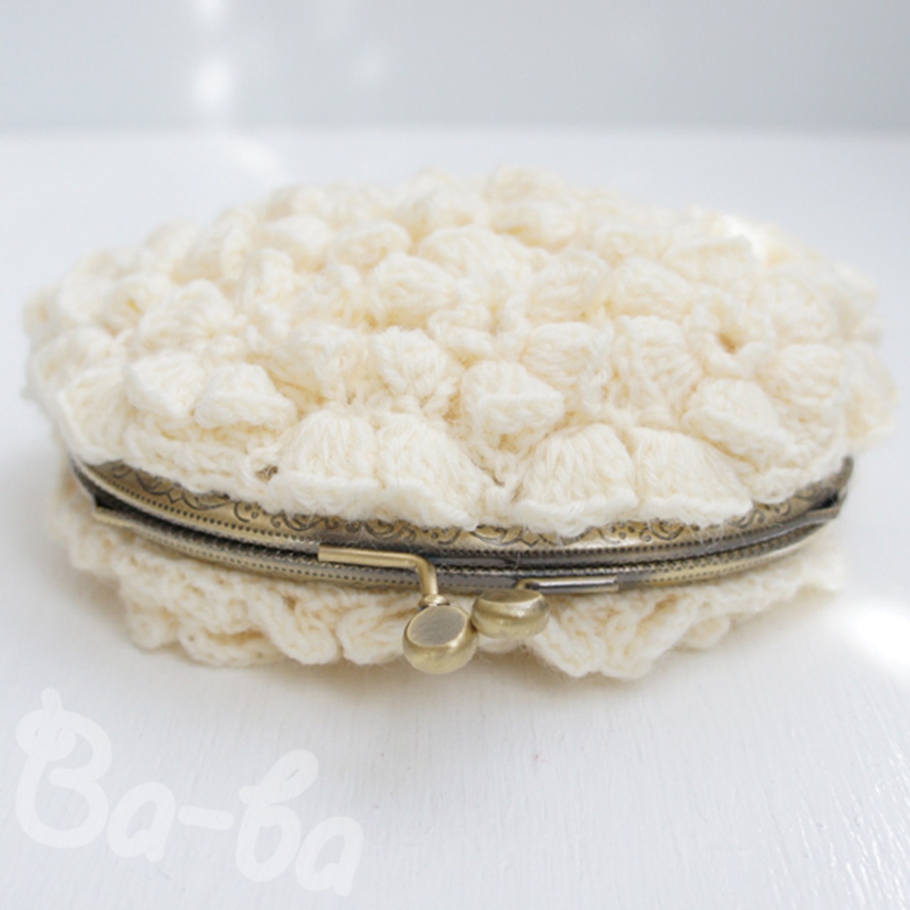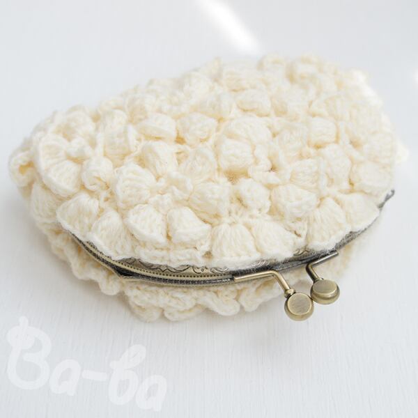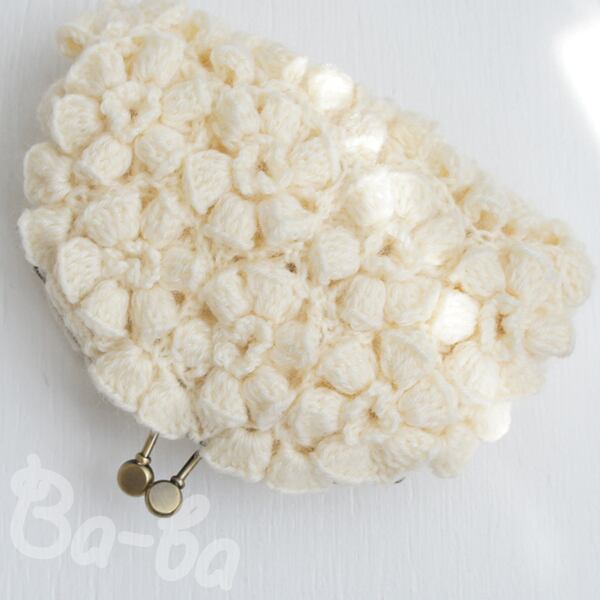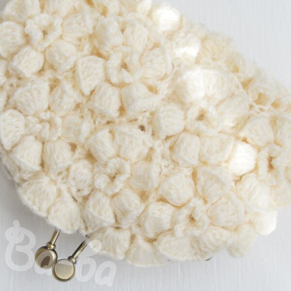 ばあば作、ポピーパフ編みのがま口 (whitepoppy・C1375)