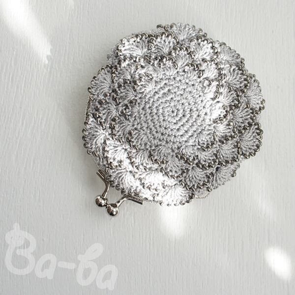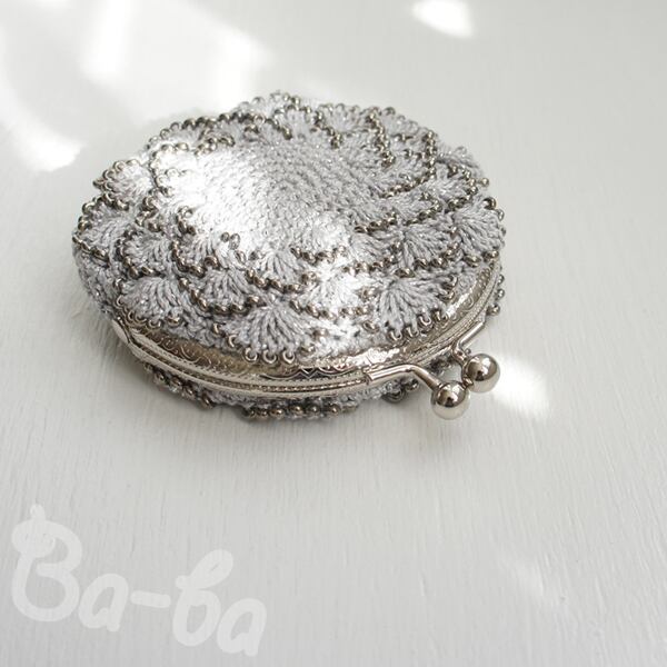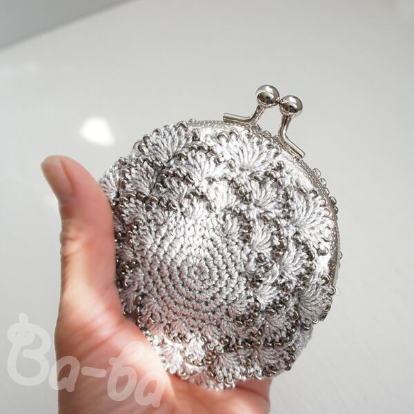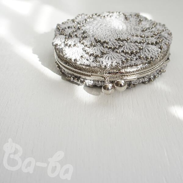 ばあば作、ビーズ入り松編み・まるまるがま口(argento・C1372)